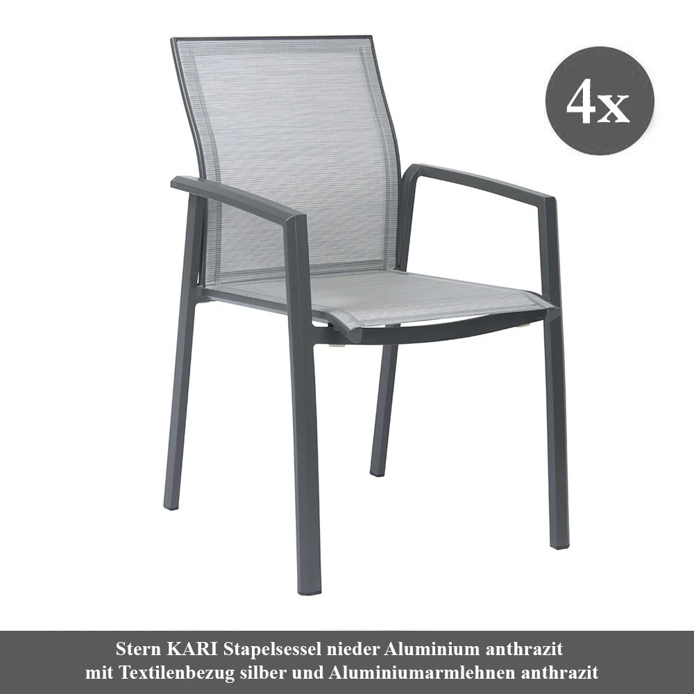 4x Stern KARI Stapelsessel Aluminium anthrazit mit Textilenbezug silber und Aluminiumarmlehnen anthrazit