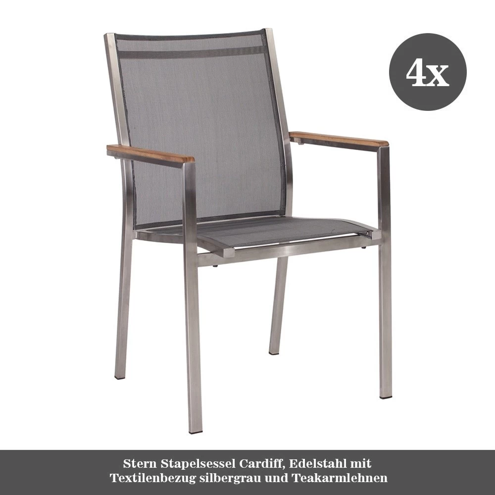 4x Stern Stapelsessel Cardiff, Edelstahl mit Textilen-Bezug schwarz und Teakarmarmlehnen