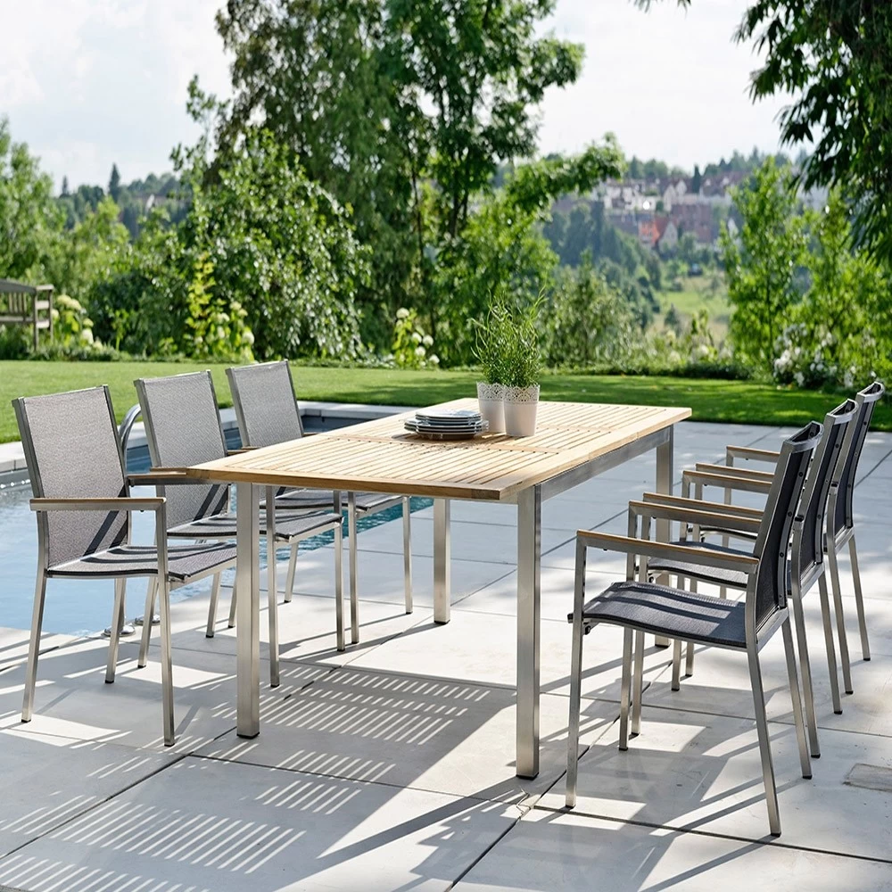 | 6x Stern Stapelsessel Polaris Edelstahl mit Bezug Textilen silbergrau und Teakarmlehnen FSC®-zertifiziert 1x Stern Ausziehtisch 162/220 x 90 cm, Edelstahl mit Teakplatte FSC®-zertifiziert |
