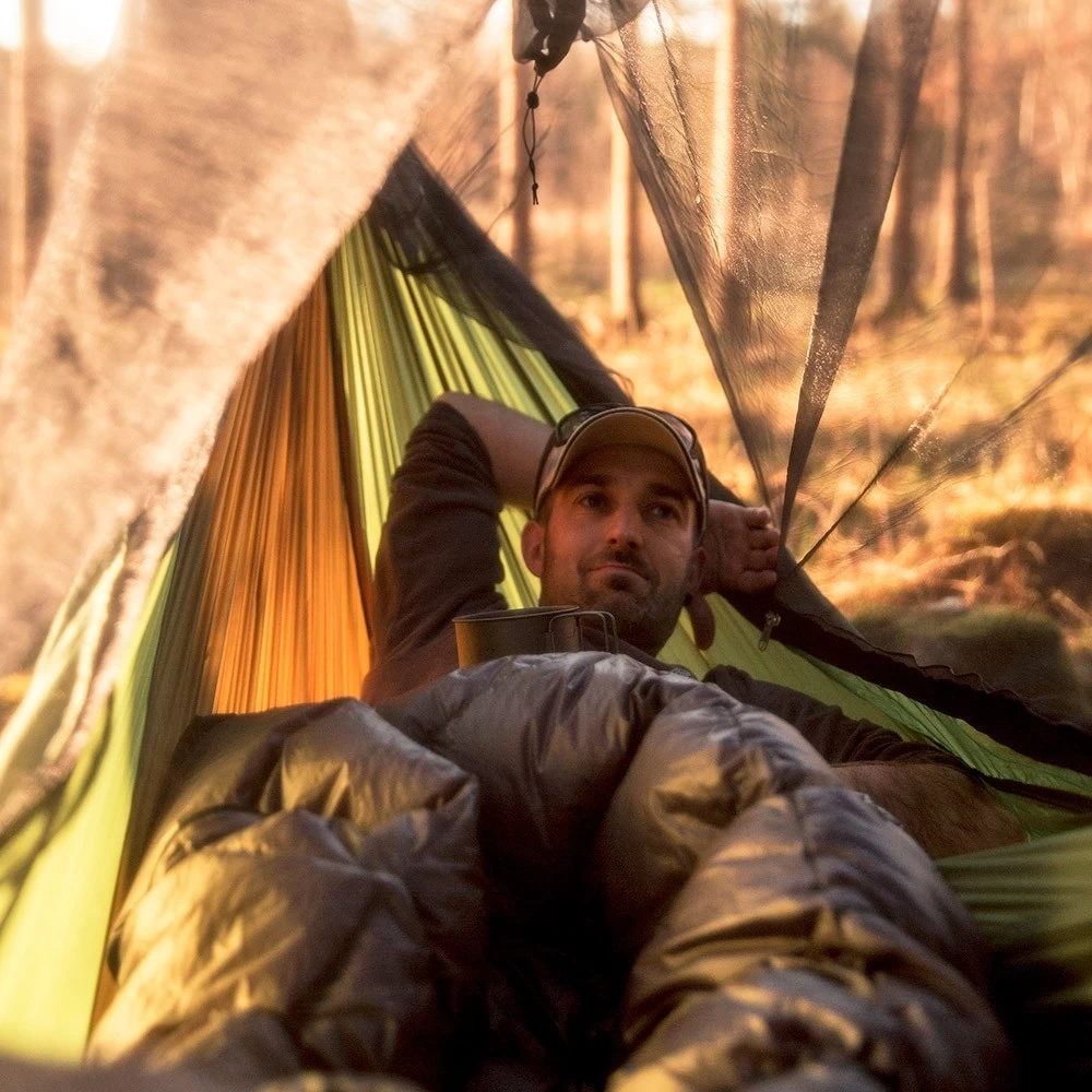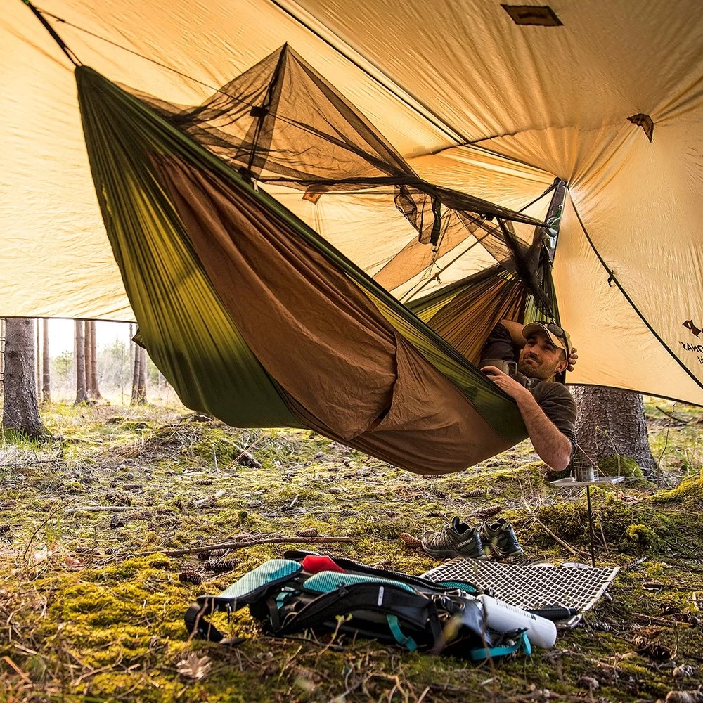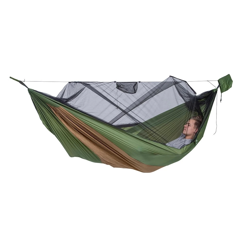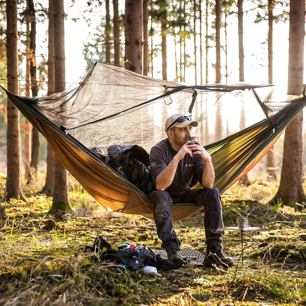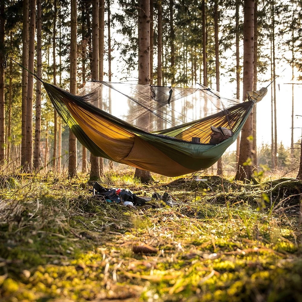 Dies ist die ideale XXL Reisehängematte, denn sie wurde so imprägniert, dass sie für Menschen nicht schädlich ist, jedoch ist sie es für nervende Insekten. Dazu schützt Sie noch das Moskitonetz, damit können Sie auch andere ungebetene Gäste nicht mehr stören. Dazu ist die Hängematte geruchsneutral und völlig hautfreundlich. Tagsüber können Sie die Hängematte einfach umdrehen und somit zum Enstpannen nutzen. Zusätzlich haben Sie auf der Unterseite ein Fach für eine Isomatte.