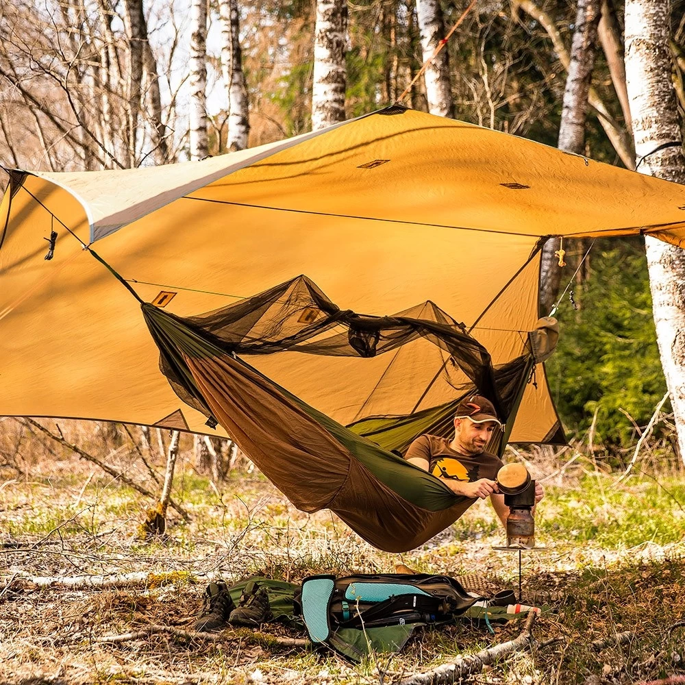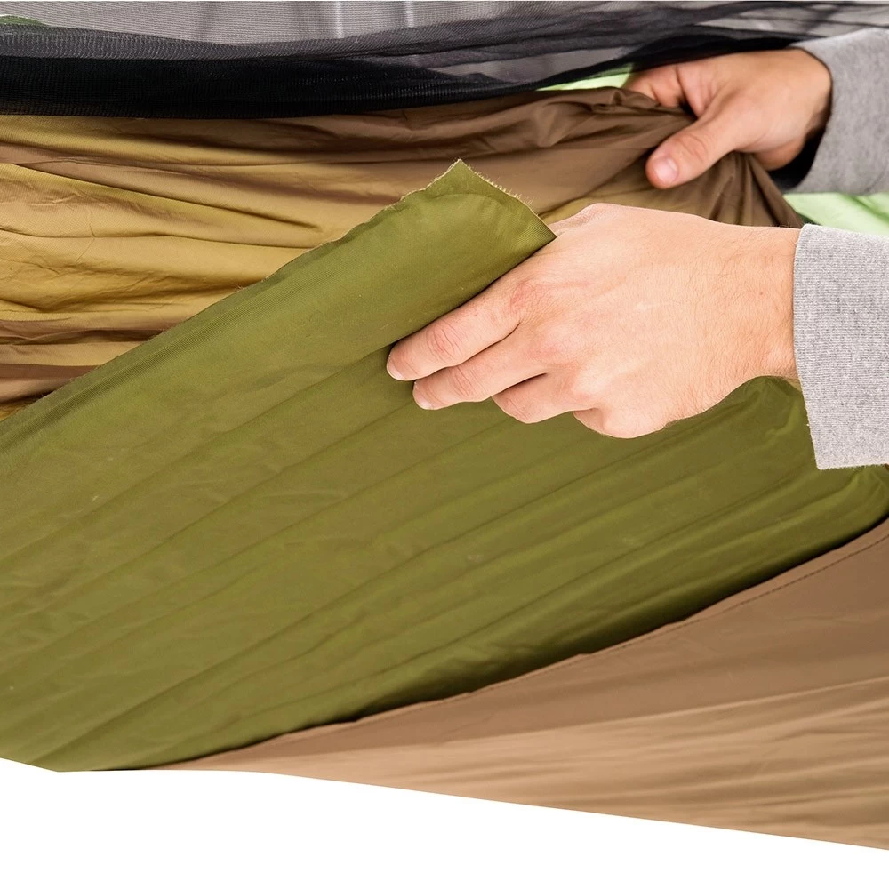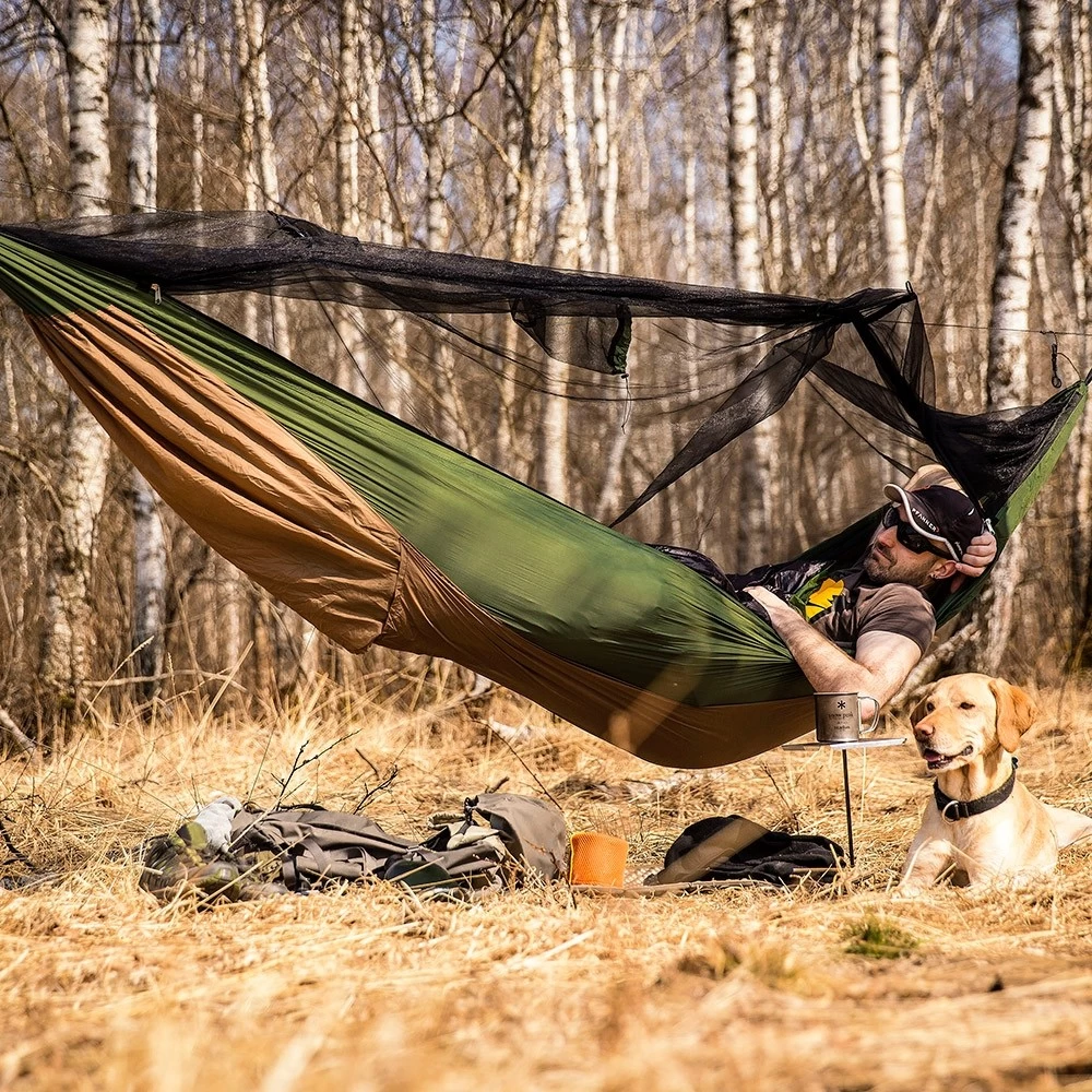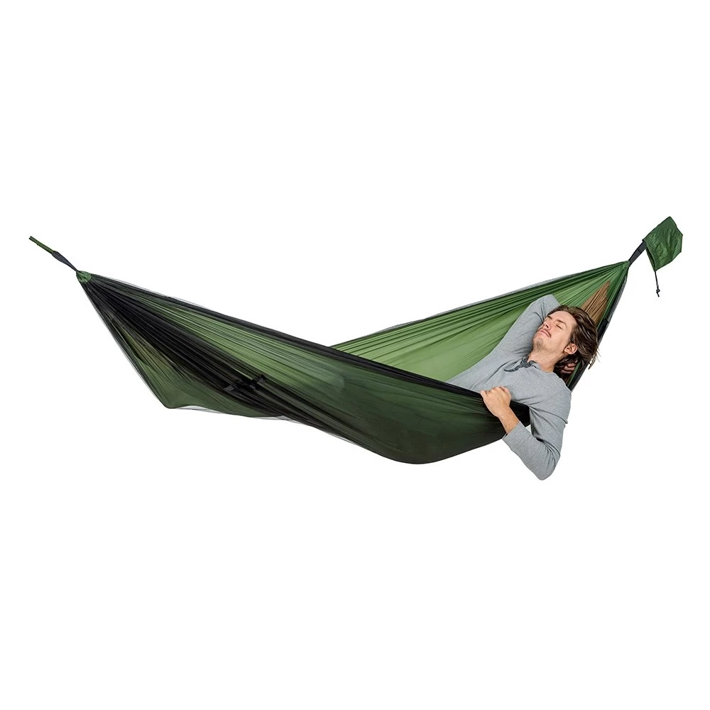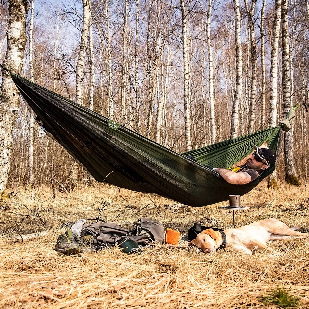 Dies ist die ideale XXL Reisehängematte, denn sie wurde so imprägniert, dass sie für Menschen nicht schädlich ist, jedoch ist sie es für nervende Insekten. Dazu schützt Sie noch das Moskitonetz, damit können Sie auch andere ungebetene Gäste nicht mehr stören. Dazu ist die Hängematte geruchsneutral und völlig hautfreundlich. Tagsüber können Sie die Hängematte einfach umdrehen und somit zum Enstpannen nutzen. Zusätzlich haben Sie auf der Unterseite ein Fach für eine Isomatte.