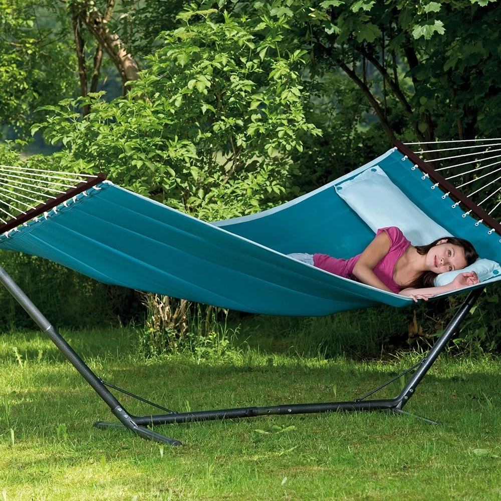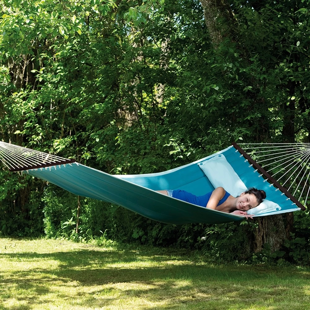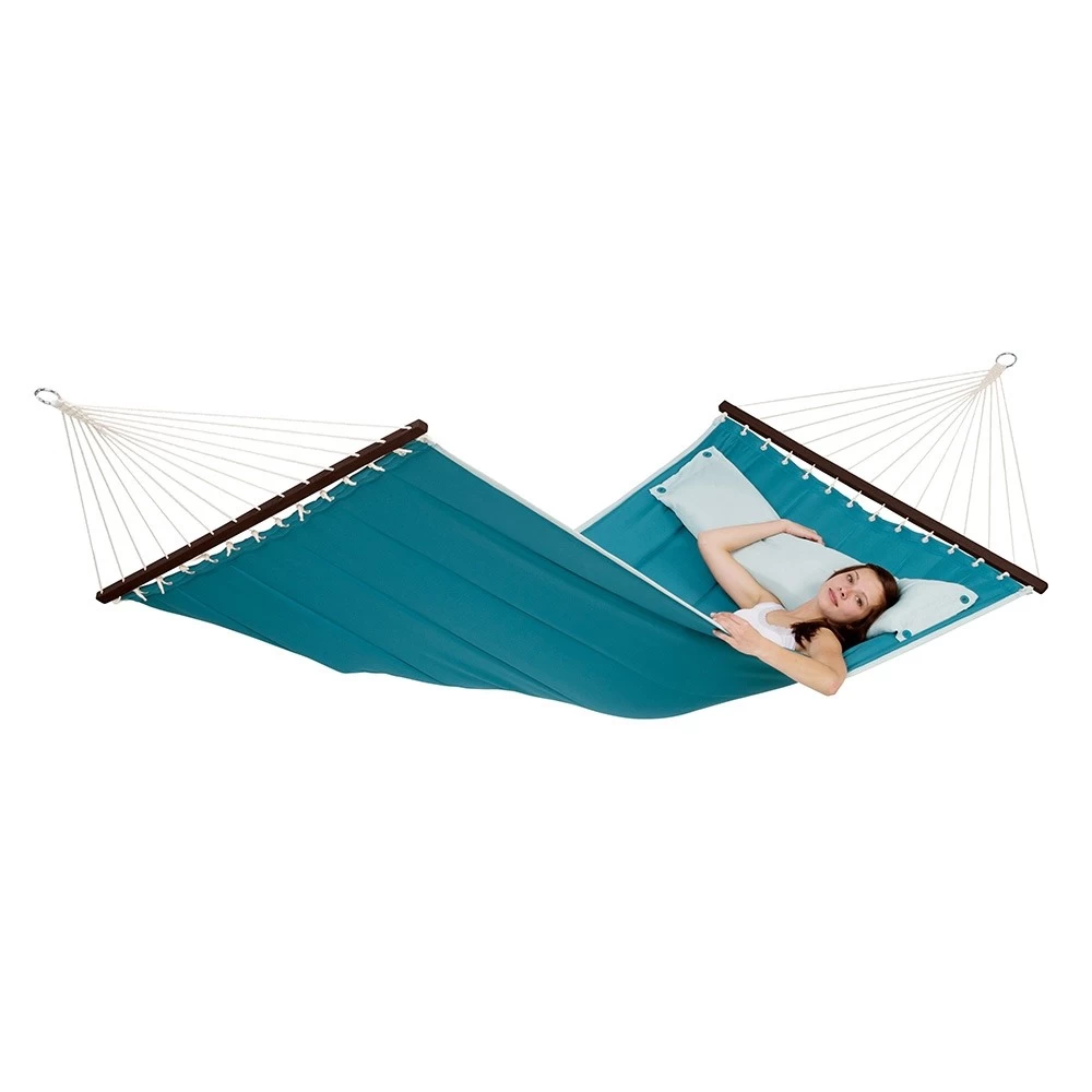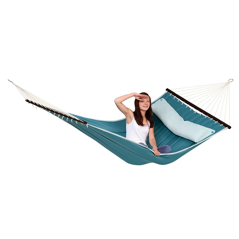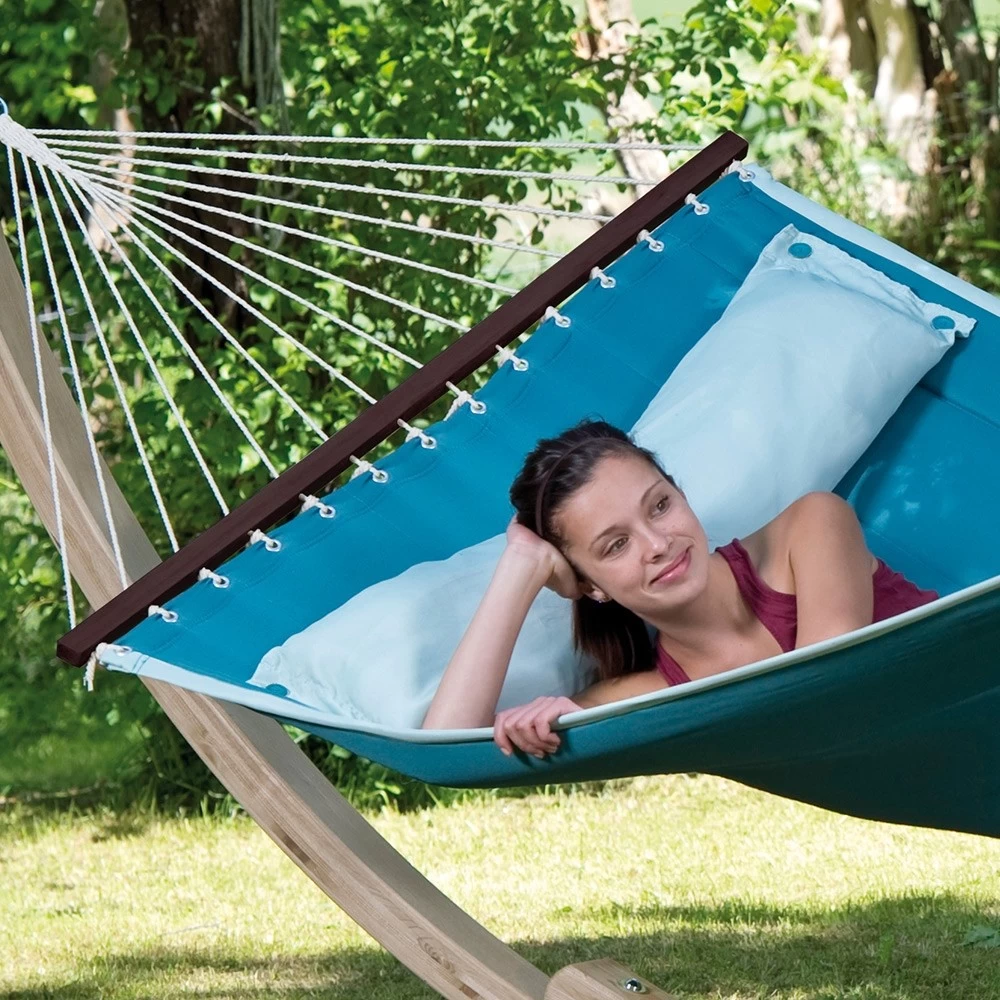 Die trendige Stabhängematte wurde im amerikanischen Design gefertigt. Daher sind sie sehr groß, weich und gefüttert. Dazu gibt es diese Stabhängematten in äußerst modernen Farben und natürlich in einem trendigen Design. Darüber hinaus besitzt diese exquisite Hängematte noch ein aufknüpfbares Kissen, wodurch Sie den idealsten und bequemsten Liegekomfort haben.