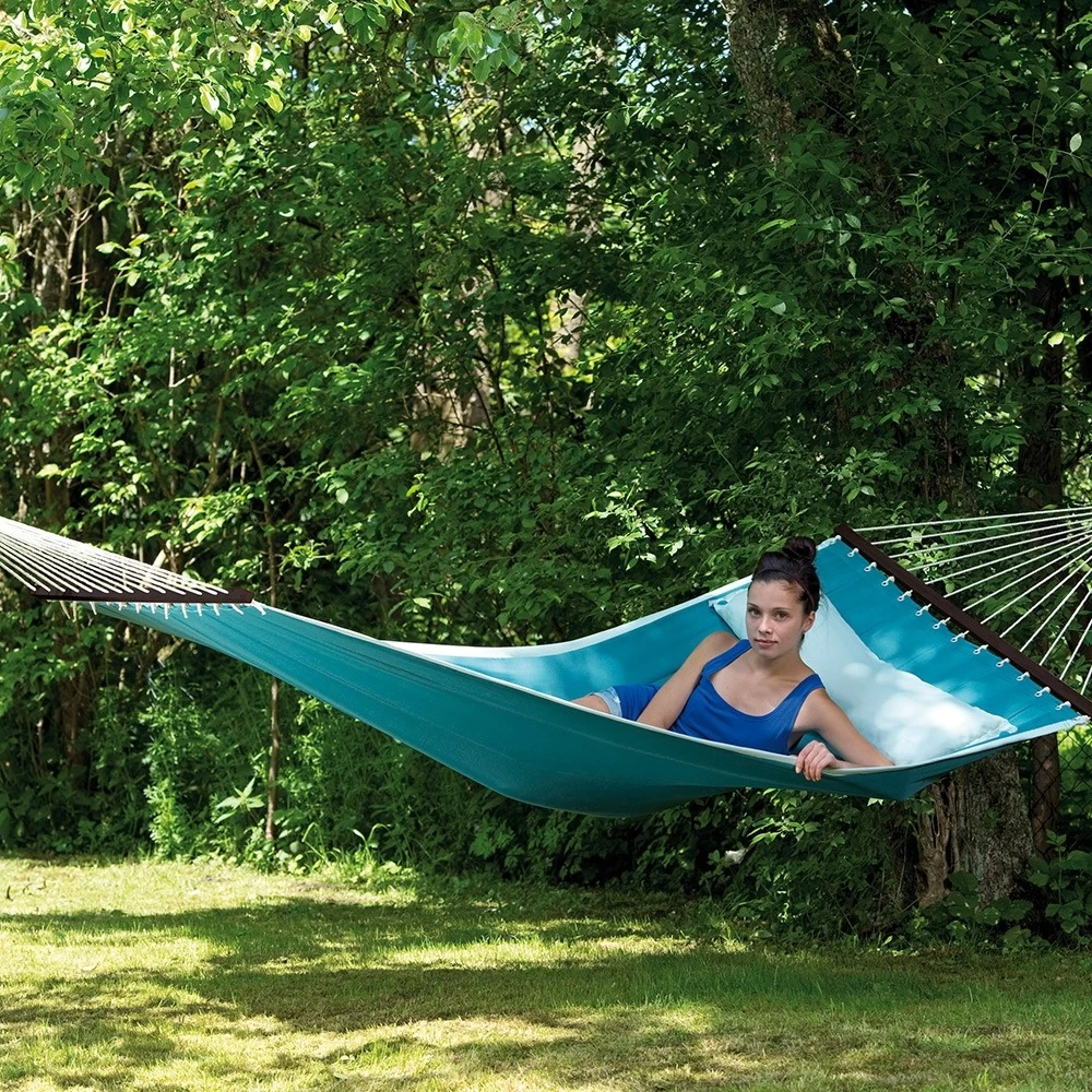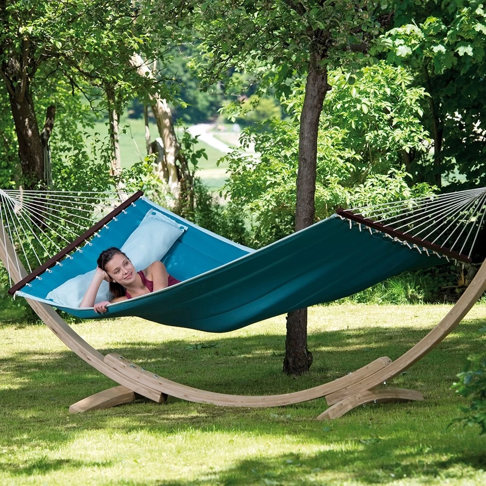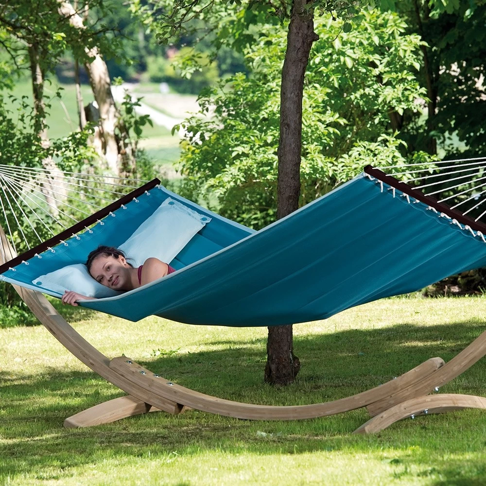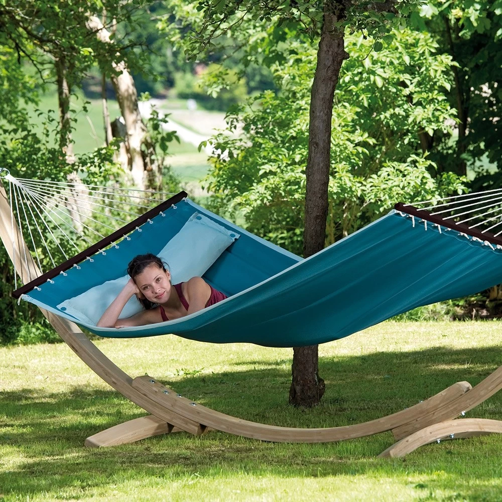 Die trendige Stabhängematte wurde im amerikanischen Design gefertigt. Daher sind sie sehr groß, weich und gefüttert. Dazu gibt es diese Stabhängematten in äußerst modernen Farben und natürlich in einem trendigen Design. Darüber hinaus besitzt diese exquisite Hängematte noch ein aufknüpfbares Kissen, wodurch Sie den idealsten und bequemsten Liegekomfort haben.