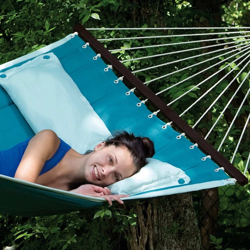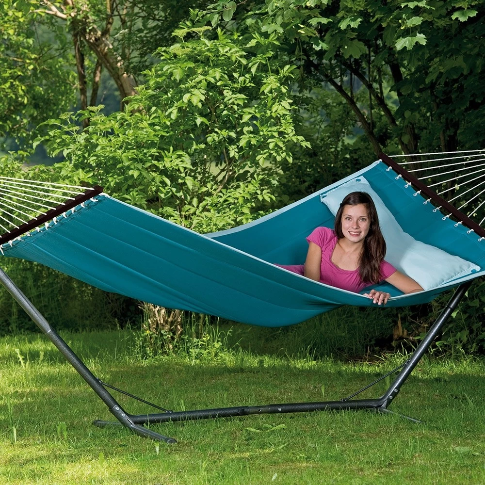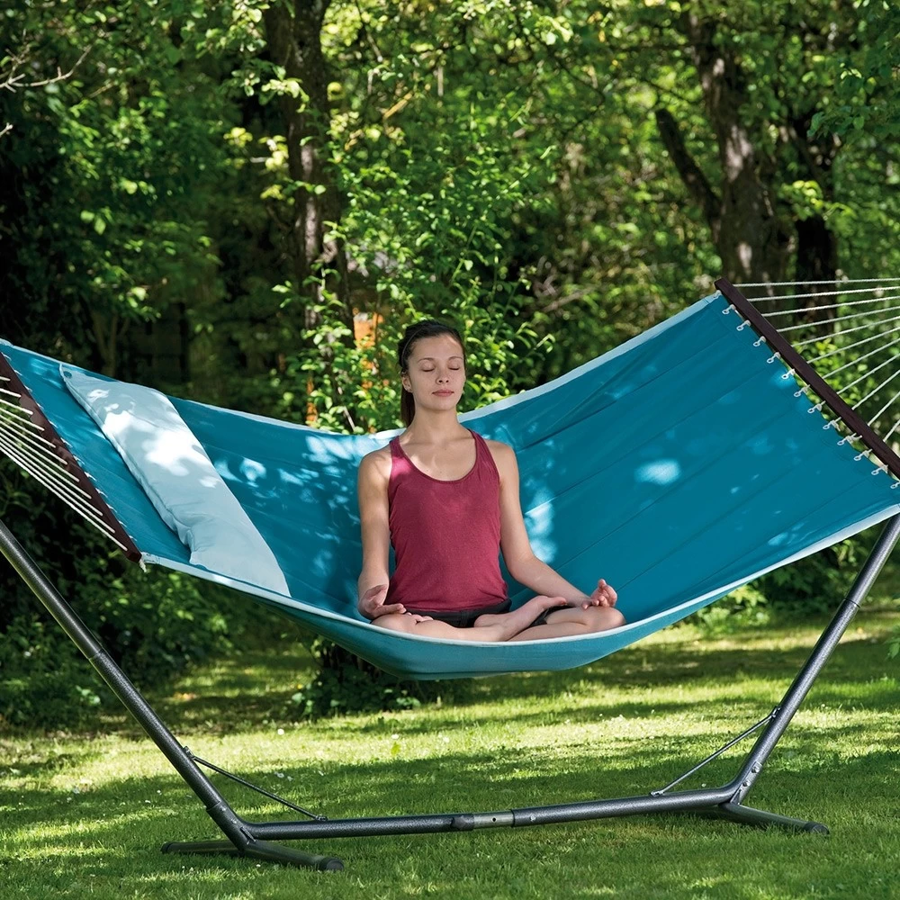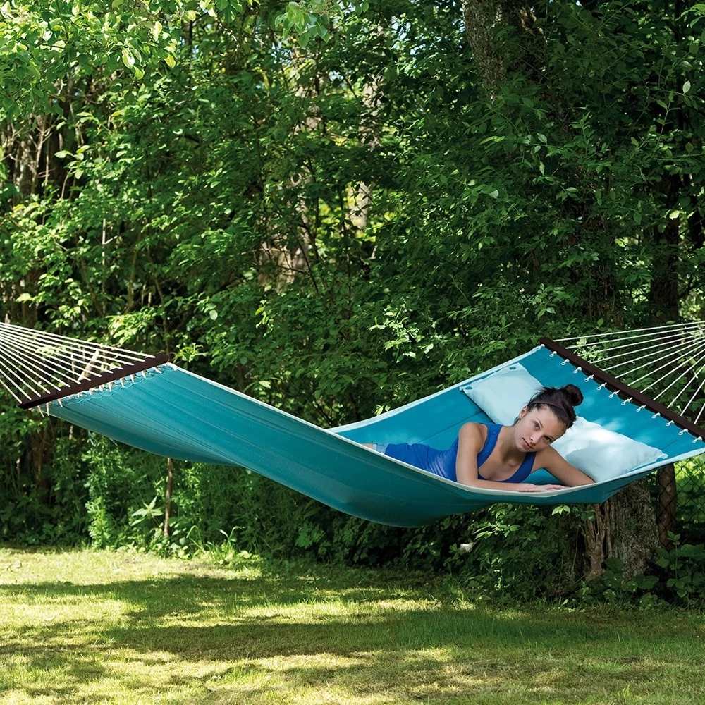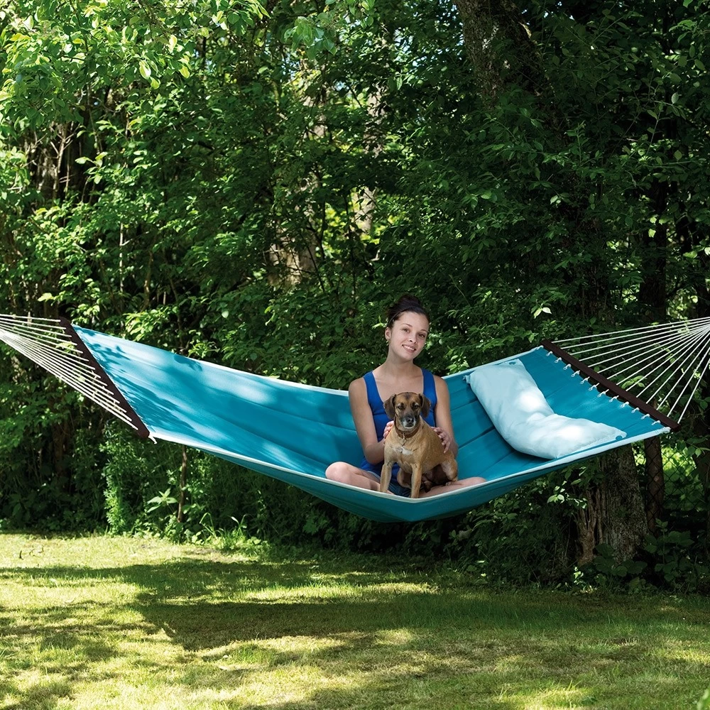 Die trendige Stabhängematte wurde im amerikanischen Design gefertigt. Daher sind sie sehr groß, weich und gefüttert. Dazu gibt es diese Stabhängematten in äußerst modernen Farben und natürlich in einem trendigen Design. Darüber hinaus besitzt diese exquisite Hängematte noch ein aufknüpfbares Kissen, wodurch Sie den idealsten und bequemsten Liegekomfort haben.