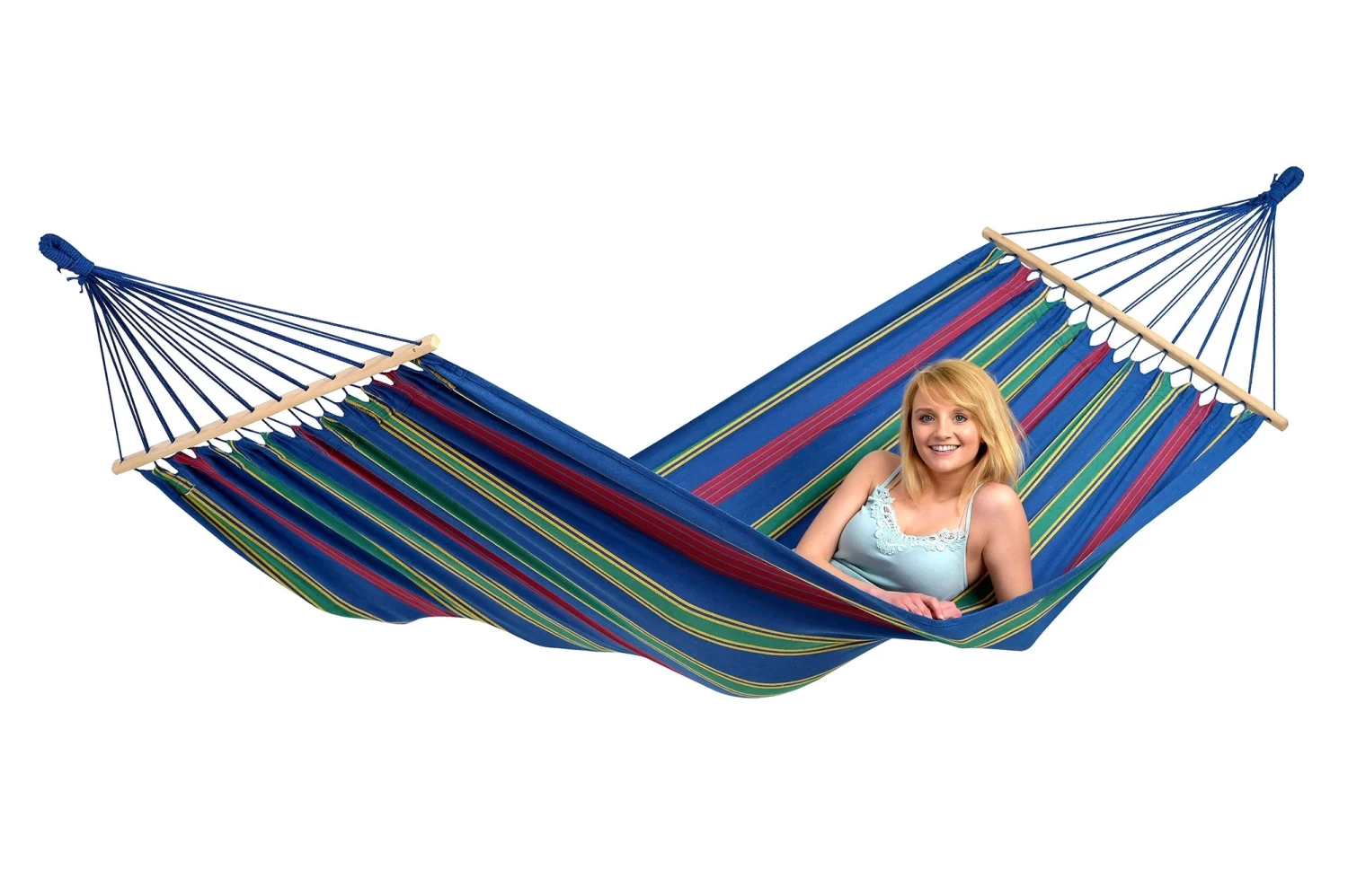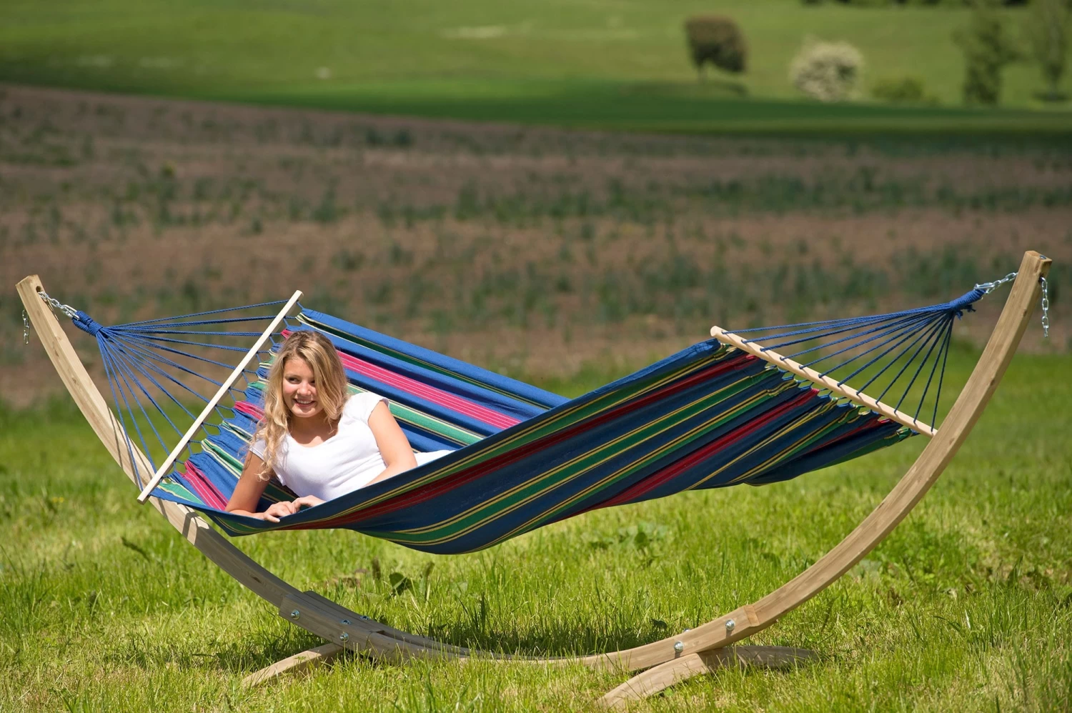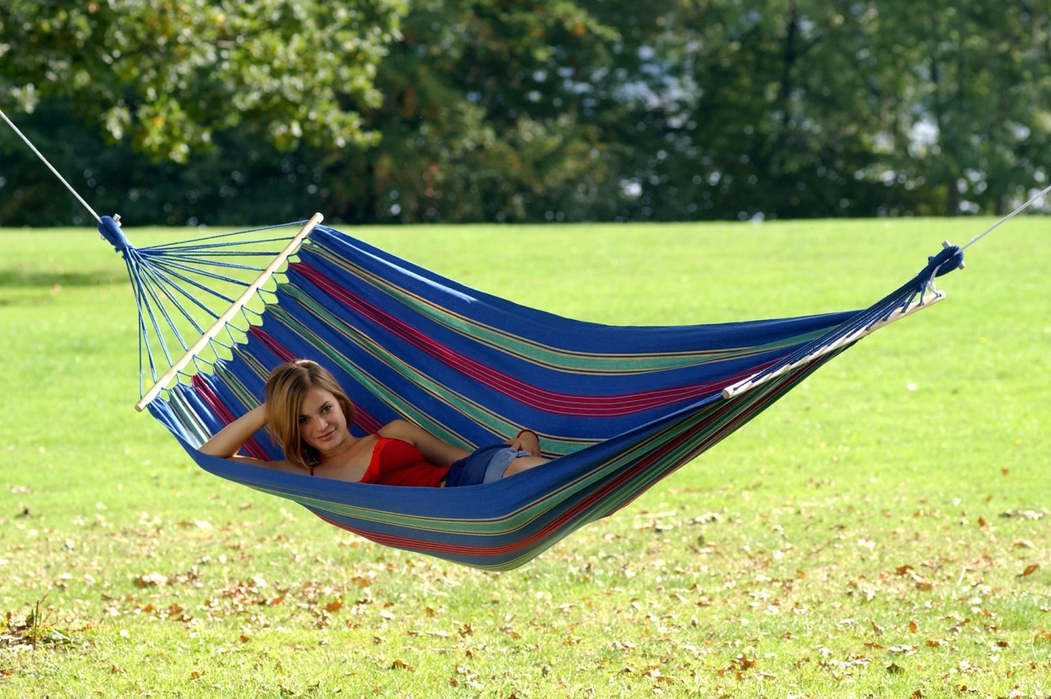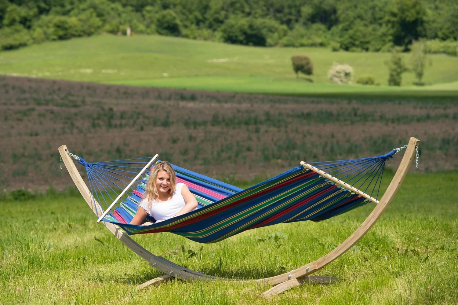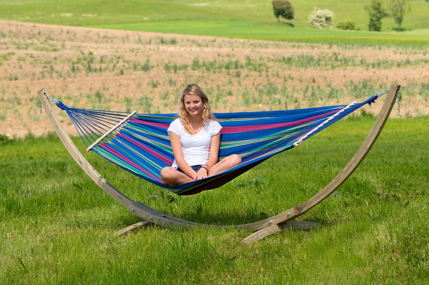 EllTex Hängematten kann man überall hängen lassen, selbst wen es regnet, oder die Sonne brennt: Denn EllTex ist ein spezielles Polyester-Baumwollgemisch, dass sehr wetterfest ist, kaum ausbleicht und auch nach wiederholtem nass werden extrem reißfest bleibt. Dazu ist es sehr kuschelig weich. Die Hängematte ist aus wetterfestem und UV-beständigem „Special cotton-feel polyester“.