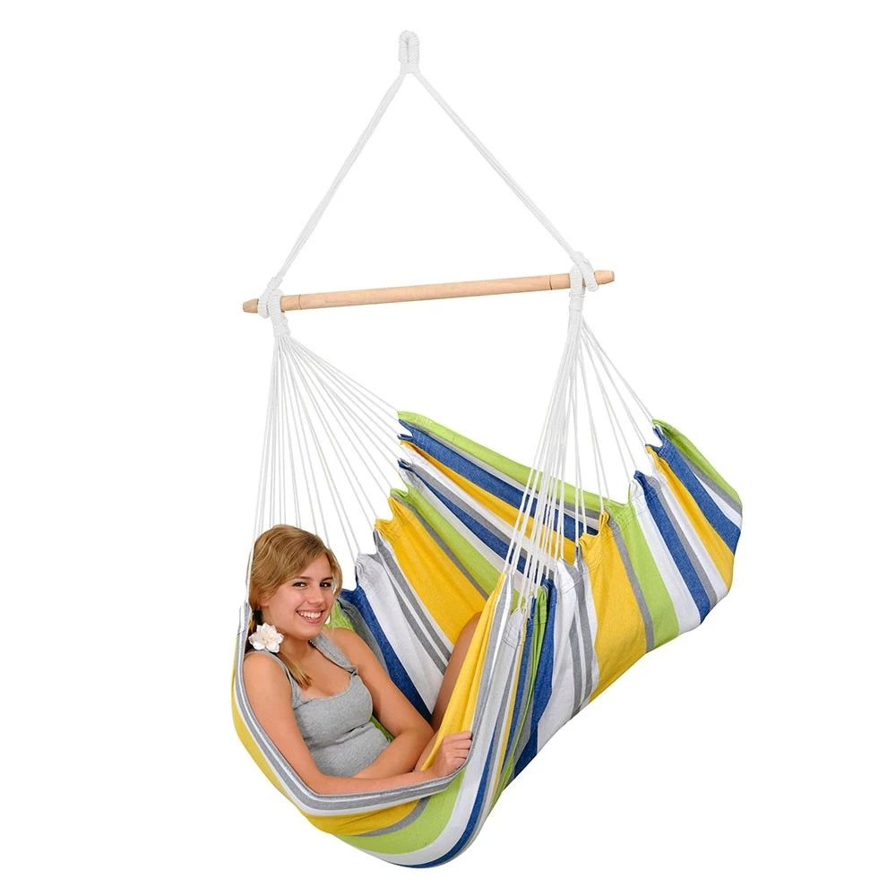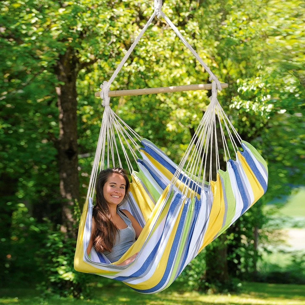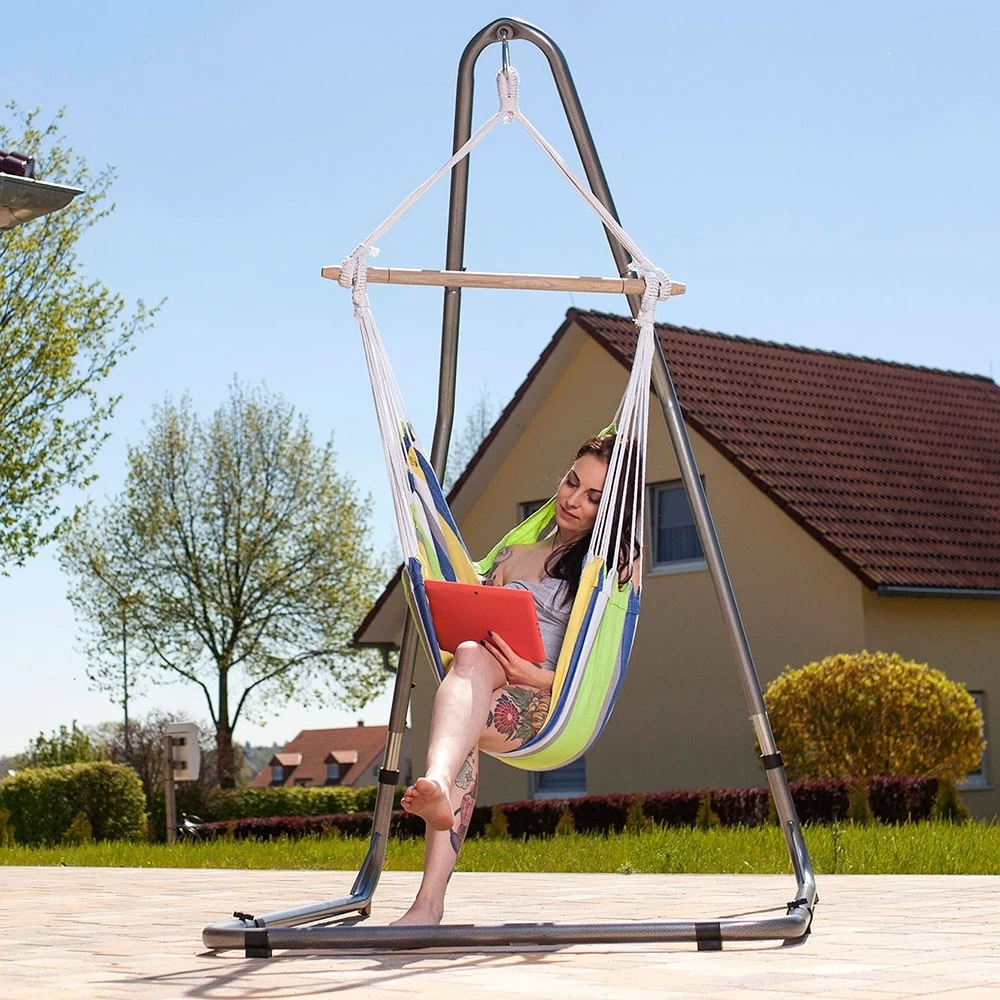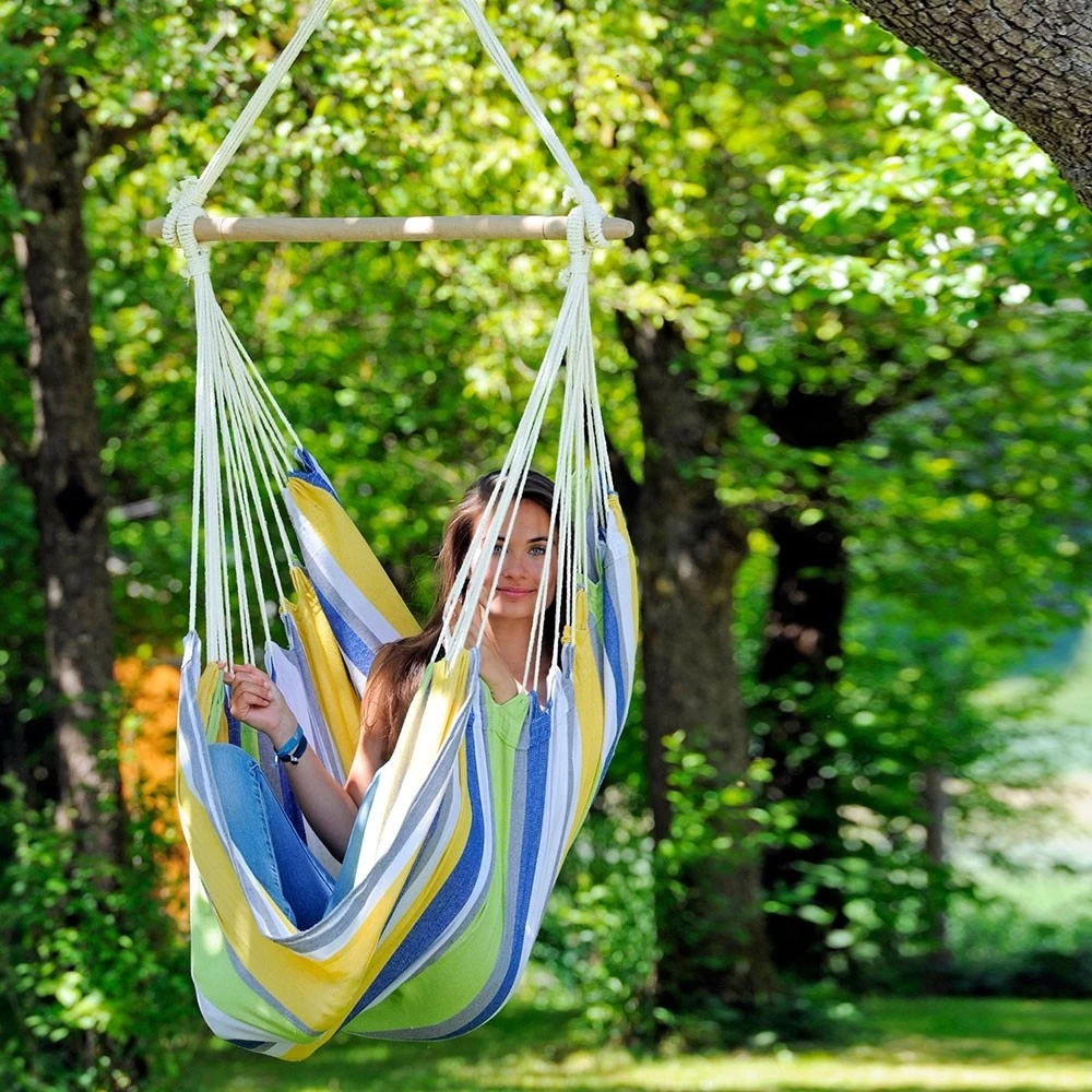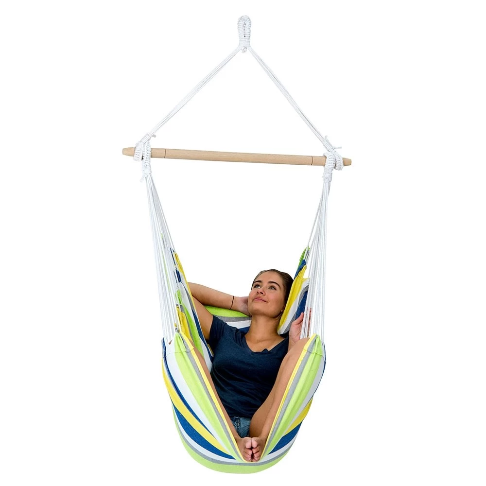 Der Hängesessel Relax hat eine seitliche Liegefläche, die dafür sorgt, dass Ihr Körpergewicht gleich mäßig verteilt wird, damit kein unerwünschter Druck direkt auf einen bestimmten Punkt Ihres Körpers ausgeübt wird. Bequemlichkeit ist ein Muss, und der Hersteller Amazonas fügt auch Sicherheit hinzu. Dieser schoner Hängesessel hat zahlreiche Aufhängeseile, die der gesamten Struktur Stärke verleihen, und eine starke Stange, aus der die Seile niemals heraus- oder hineinrutschen können.