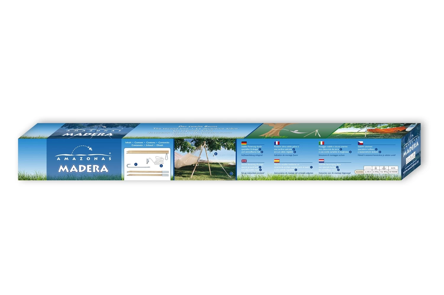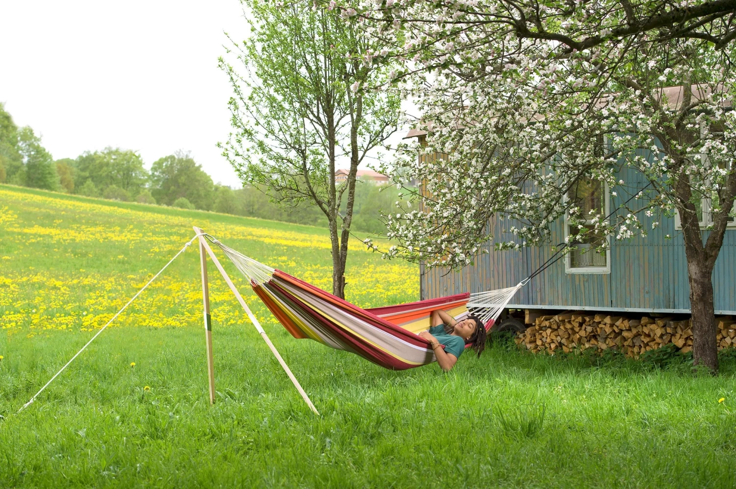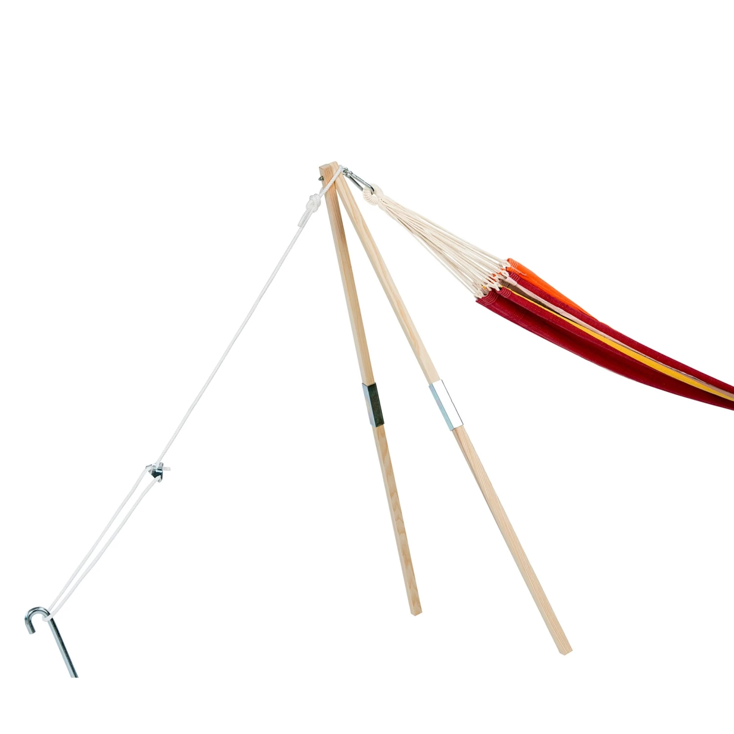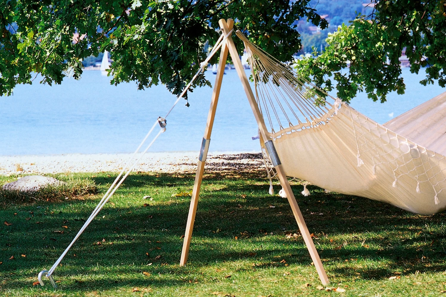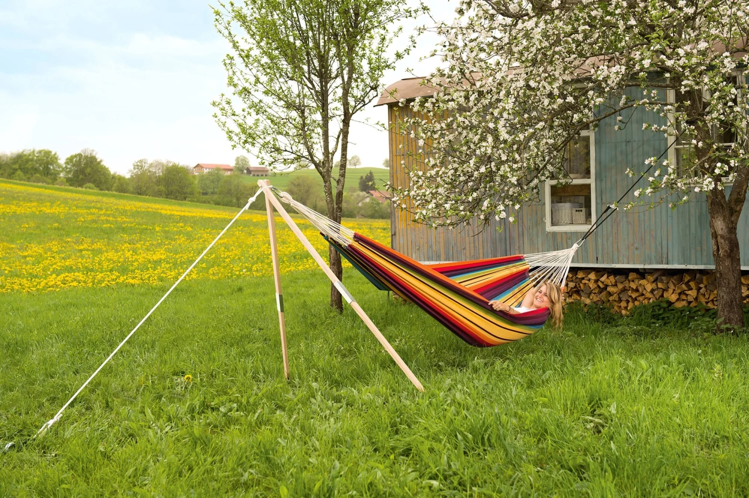 Dieses praktische Gestell ist ideal für Camping, oder fürs einfach entspannen im Garten. Wenn es auf einer Seite eine Befestigungsmöglichkeit gibt (z.B. eine Baum oder eine Hauswand), wird das Gestell aus Eschenholz auf der freien Seite mit einem Erdnagel verankert. Anschließend müssen Sie nur noch die Hängematte einhängen und schon kann es losgehen. Diese Gestell ist für alle Hängematten geeignet.