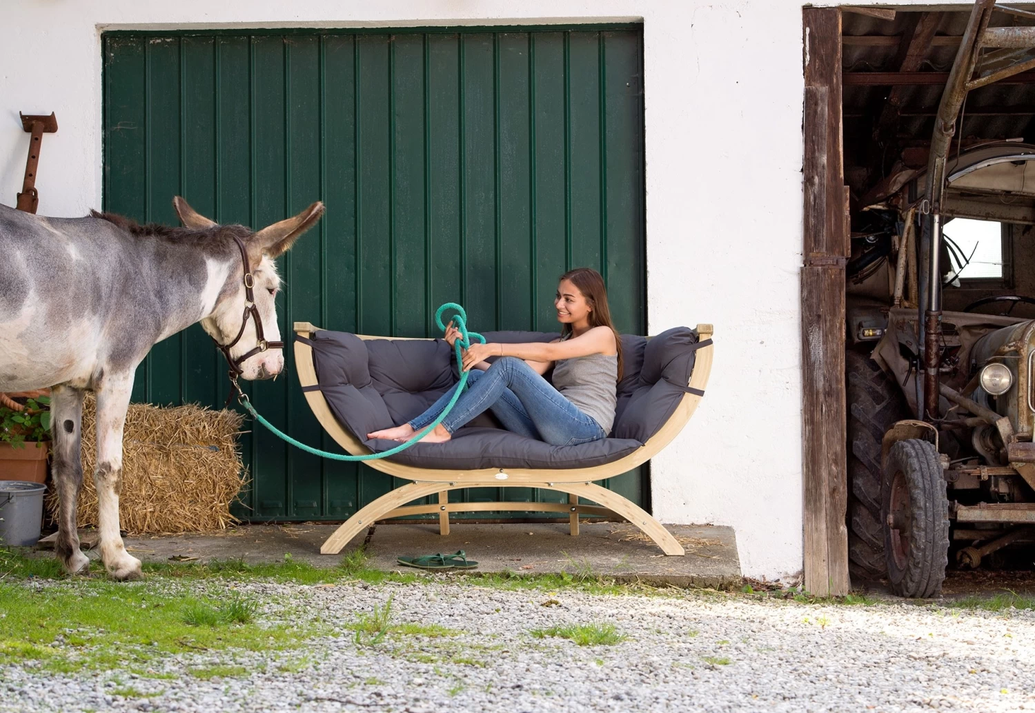 Für die Polsterung wurde der wetterfeste Agorastoff eingesetzt. Dieser ist genau so weich wie Baumwolle, hat aber die Vorteile, dass der Agorastoff sehr widerstandsfähig, wasserabweisend, schimmelresistent und pflegeleicht ist. Zudem besitzt er eine hohe UV-beständigkeit und ist besonders schmutzunempfindlich.