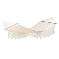 Diese hochklassige Stabhängematte ist aus reinster Baumwolle und wurde in der aufwändigen und meisterlichen Jaquard-Technik gewebt, mit handgefertigten Macrameeabschlüssen. Zudem ist die Hängematte mit wunderschönem Schmucksaum verziert worden. Die extrem große Liegefläche und die hohe Belastbarkeit ist diese Hängematte ideal für 2 Personen. Der stabile Spreizstab ist aus feinstem brasilianischem Hartholz gefertigt. Die Aufhängeschnüre sind in einen festen Kern eingearbeitet und können somit, auch trotz Reibung, nicht reißen. Daher erhalten Sie mit diesem Produkt eine Hängematte, welche optisch ein absoluter Hingucker ist, aber auch qualitativ äußerst hochwertig ist.