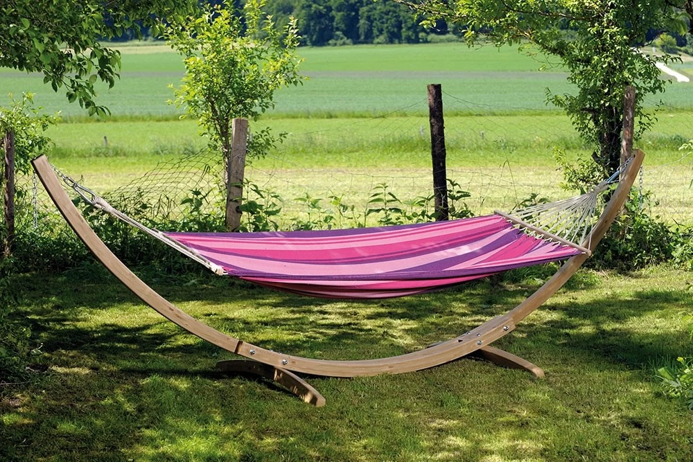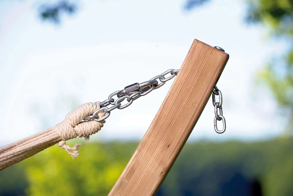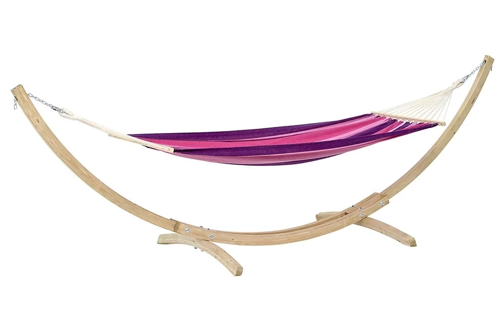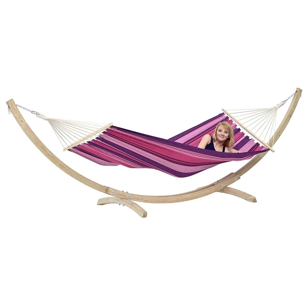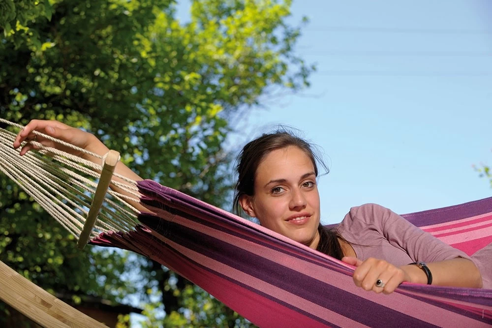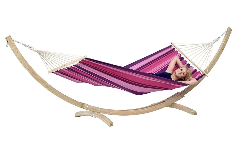 Zu diesem stabilen Gestell kommt die Hängematte Tonga Candy hinzu. Sie ist eine Hängematte mit Spreizstäben, welche aus dem bekanntlich extrem widerstandsfähigen Material des Herstellers Amazonas EllTex gefertigt ist und somit eine stilvolle Resistenz gegen Regenfälle und leichtes UV-Licht bietet.