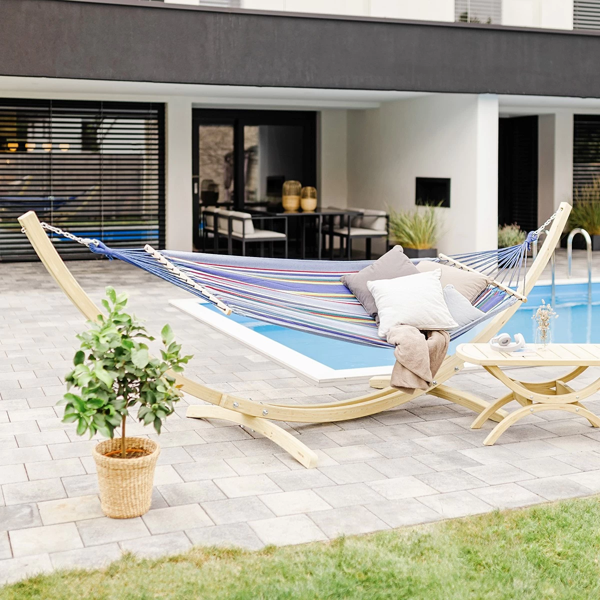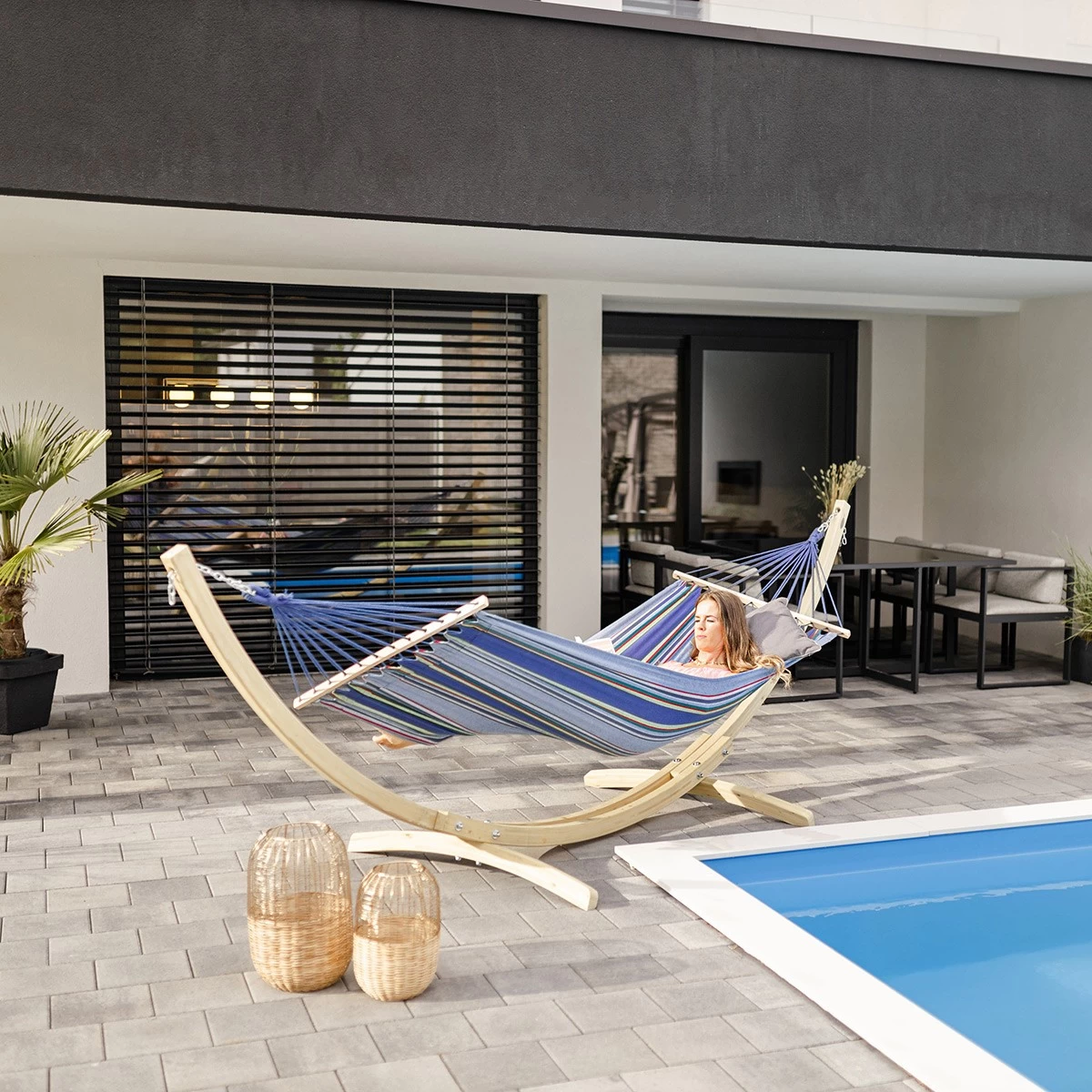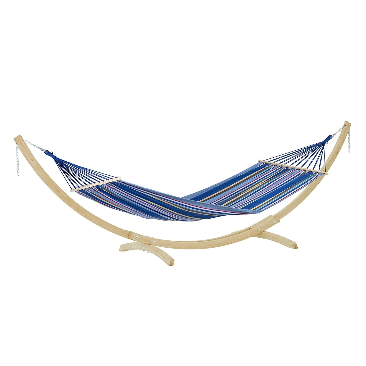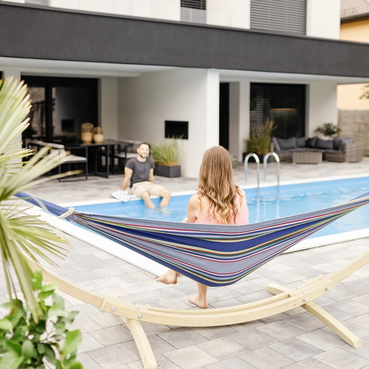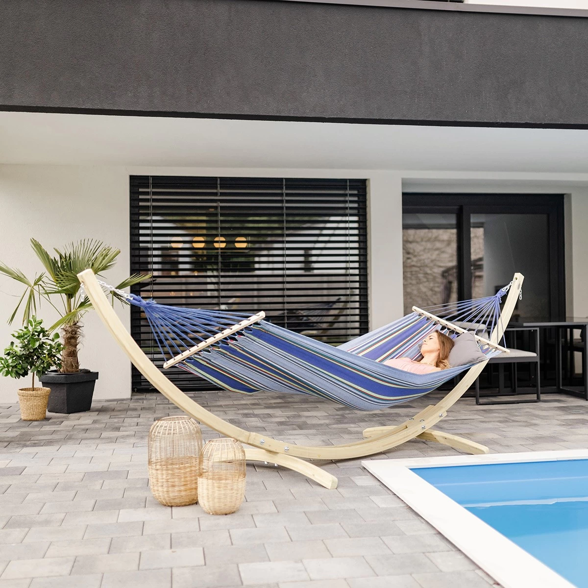 Zu einem solch stabilen Gestell wird die Tonga-Hängematte hinzugefügt: Es handelt sich um eine Hängematte mit Spreizstäben, die aus dem berühmten ultra-resistenten Material des Herstellers Amazonas EllTex hergestellt wird und beste Beständigkeit gegen Witterungseinflüsse und leichtes ultraviolettes Licht bietet.