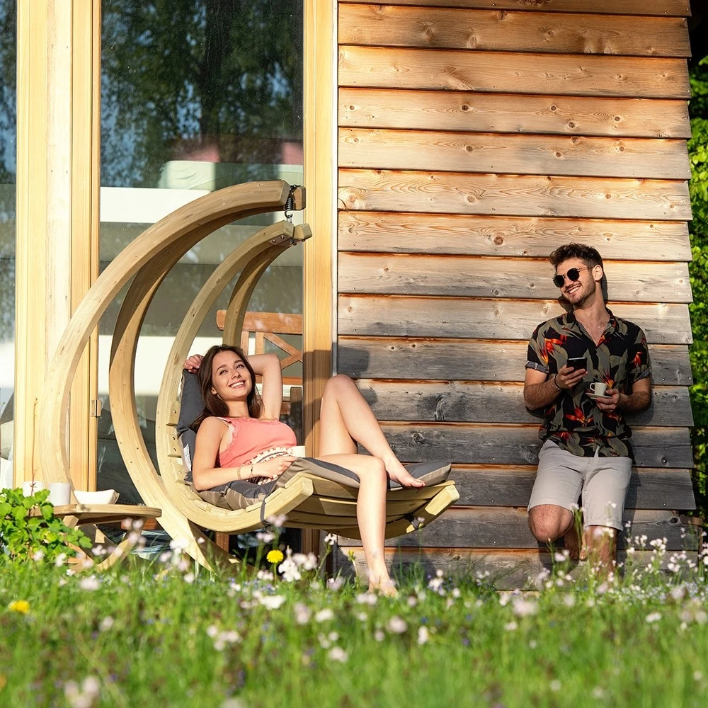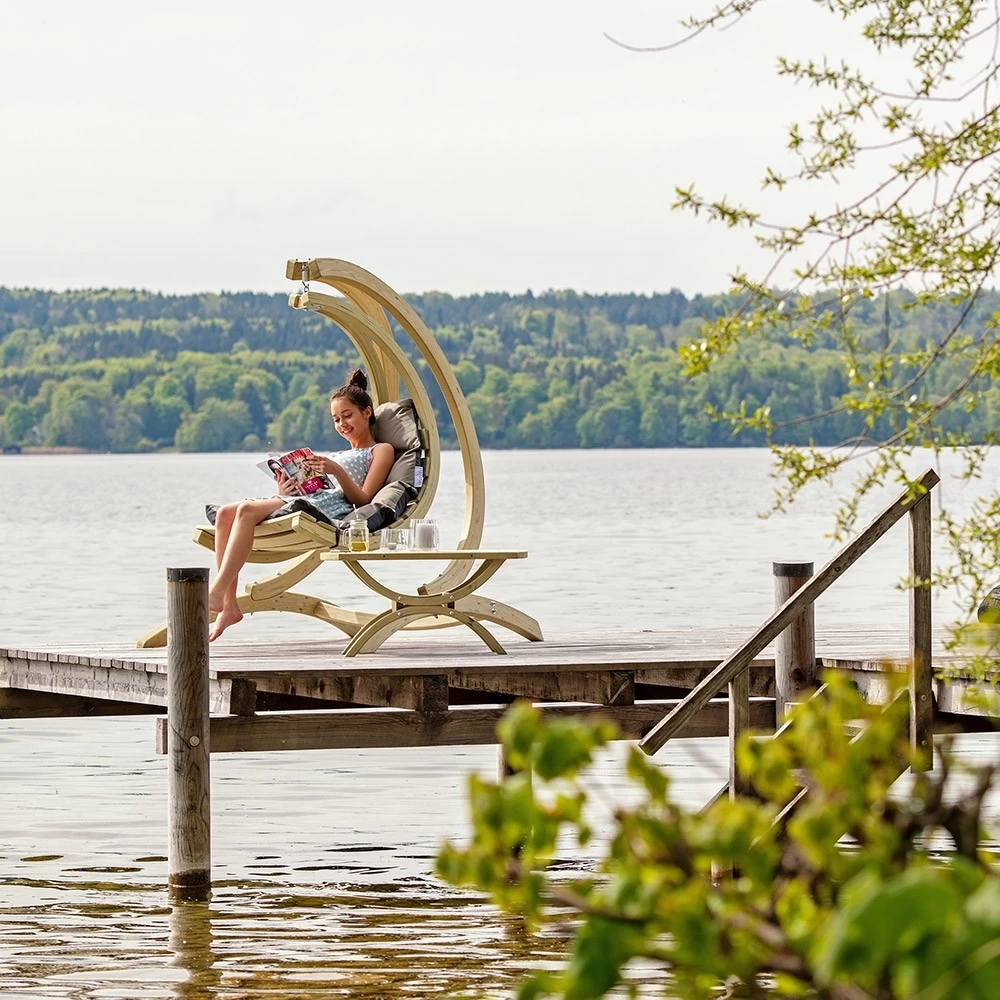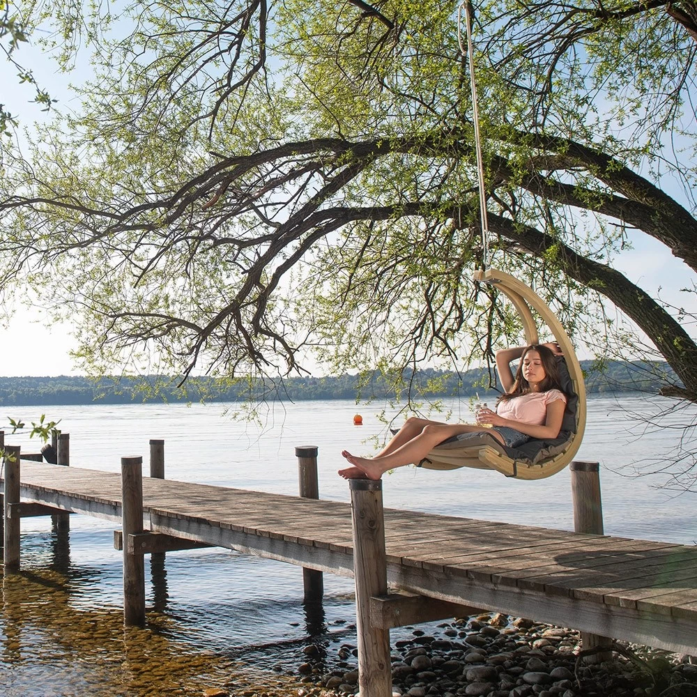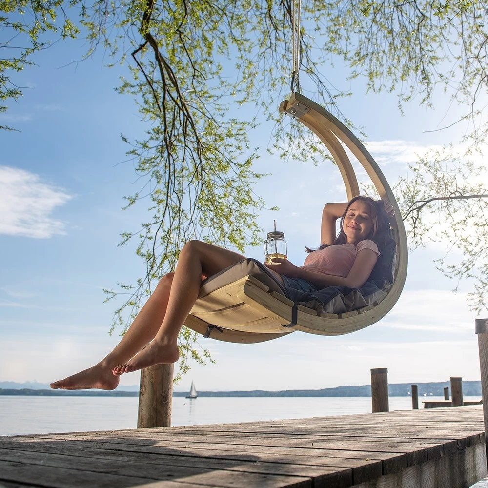 Lehnen Sie sich tiefentspannt zurück und genießen Sie Ihren SWING CHAIR. Nutzen Sie ihn als schwebende Liege im passenden Gestell GLOBO STAND (Dieser ist nicht in der Lieferung enthalten).