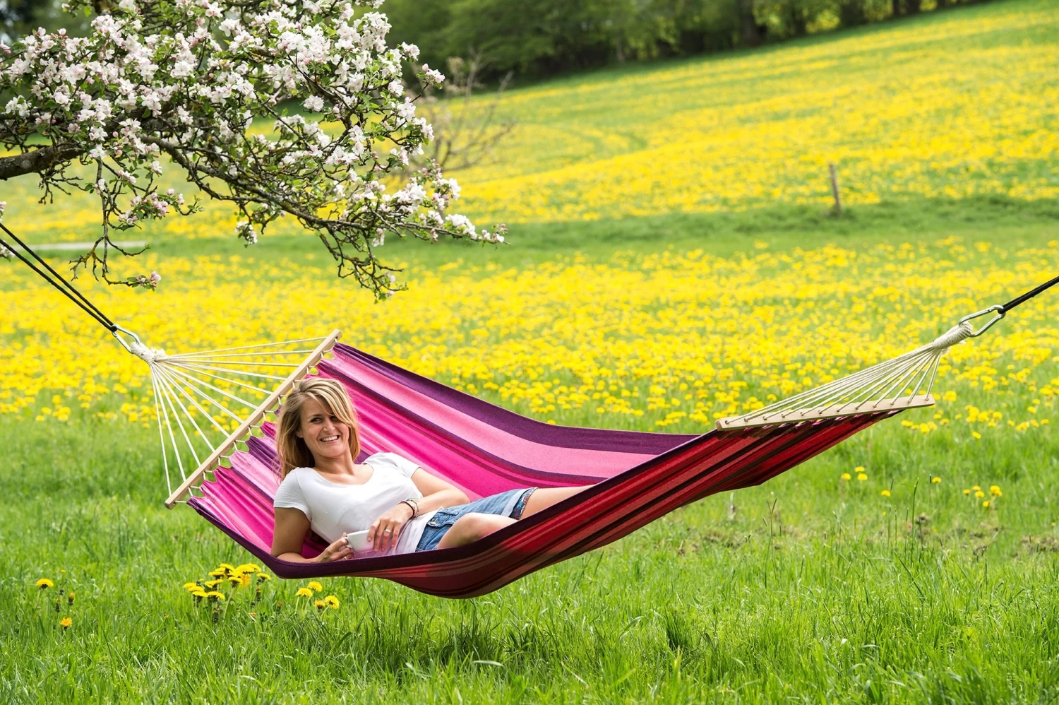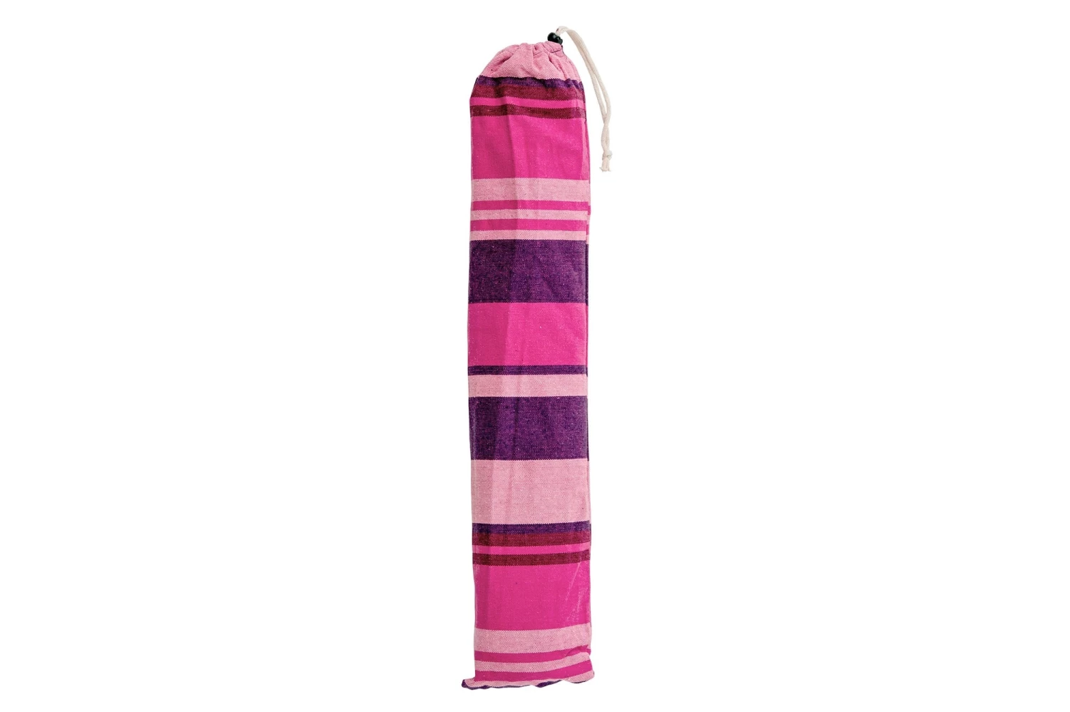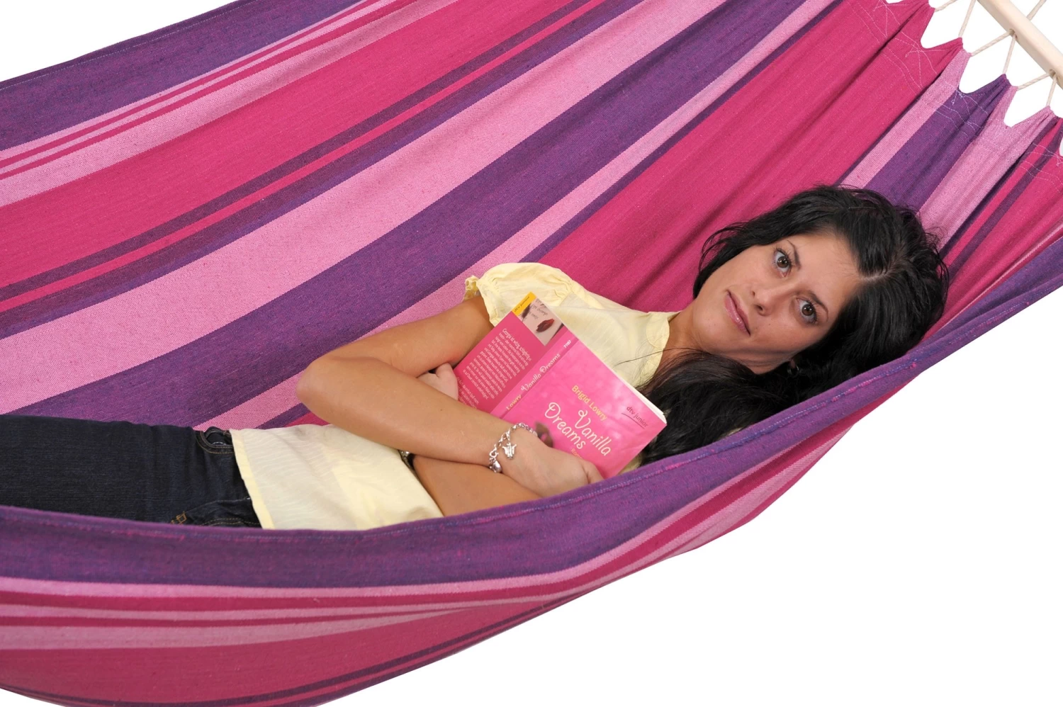 Diese Hängematte ist kein Riese, dennoch ist sie äußerst bequem. Durch die extra langen Schnüre und breiten Stoffbahnen haben wir es geschafft, dass selbst weniger große Hängematten wirklich bequem werden. Die Farbfamilie „candy“ist ein ansprechende Mischung aus Violett, Mauve und Rosatönen. Durch dieses extravagante Farbmuster ist ein absolutisches optisches Highlight.