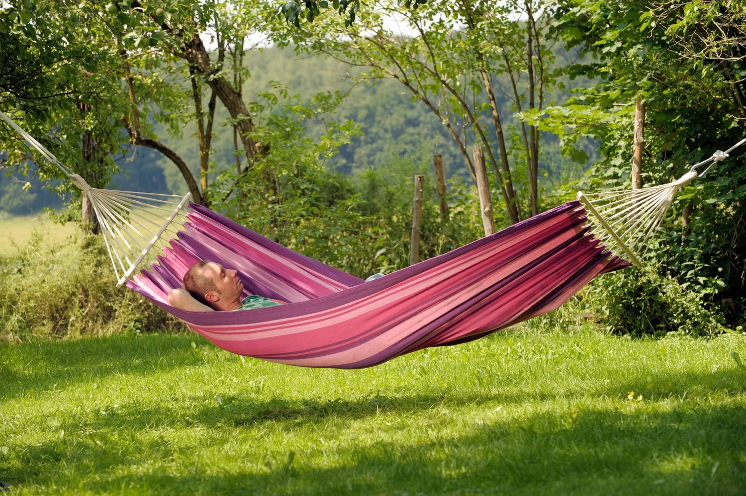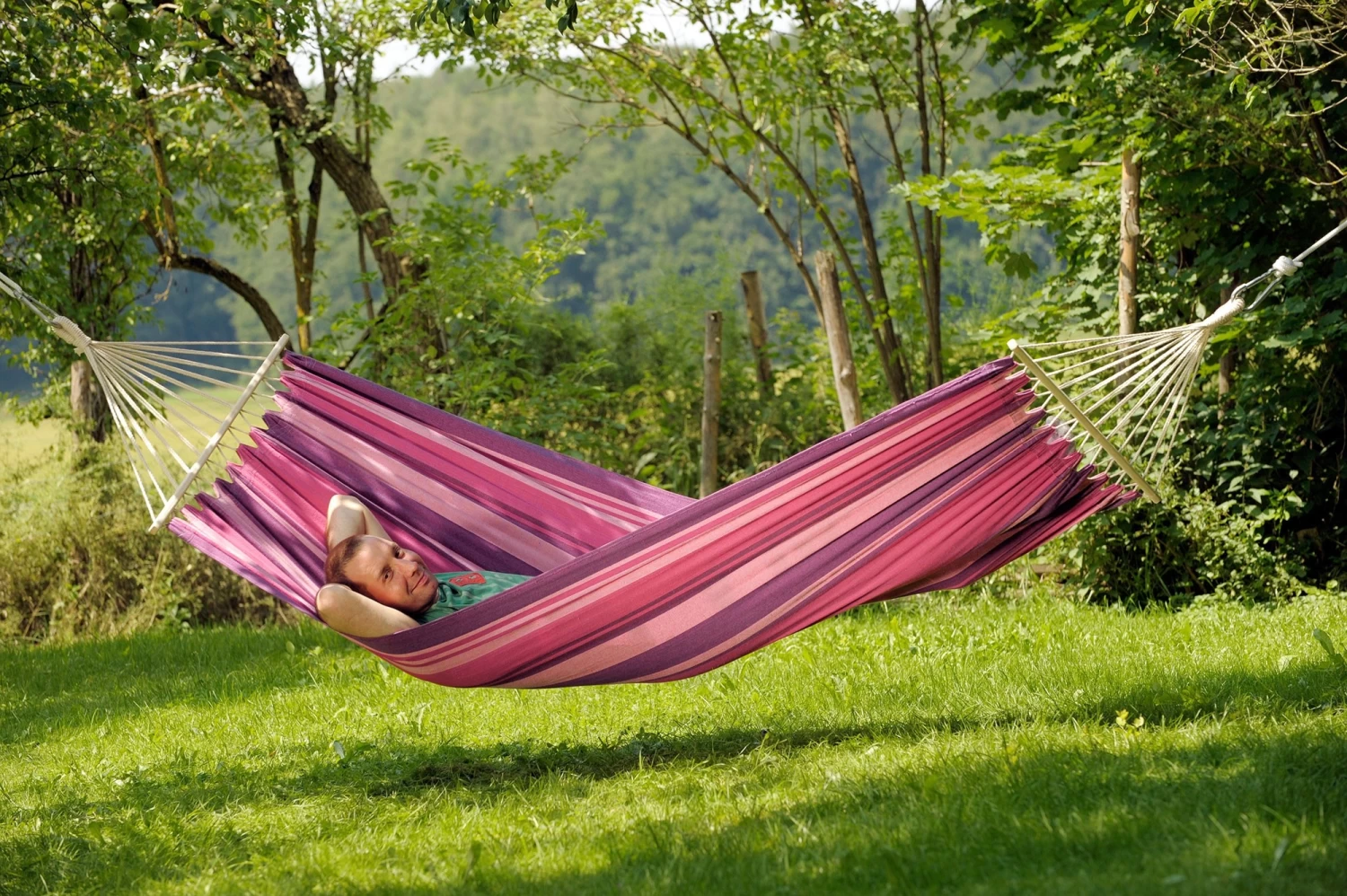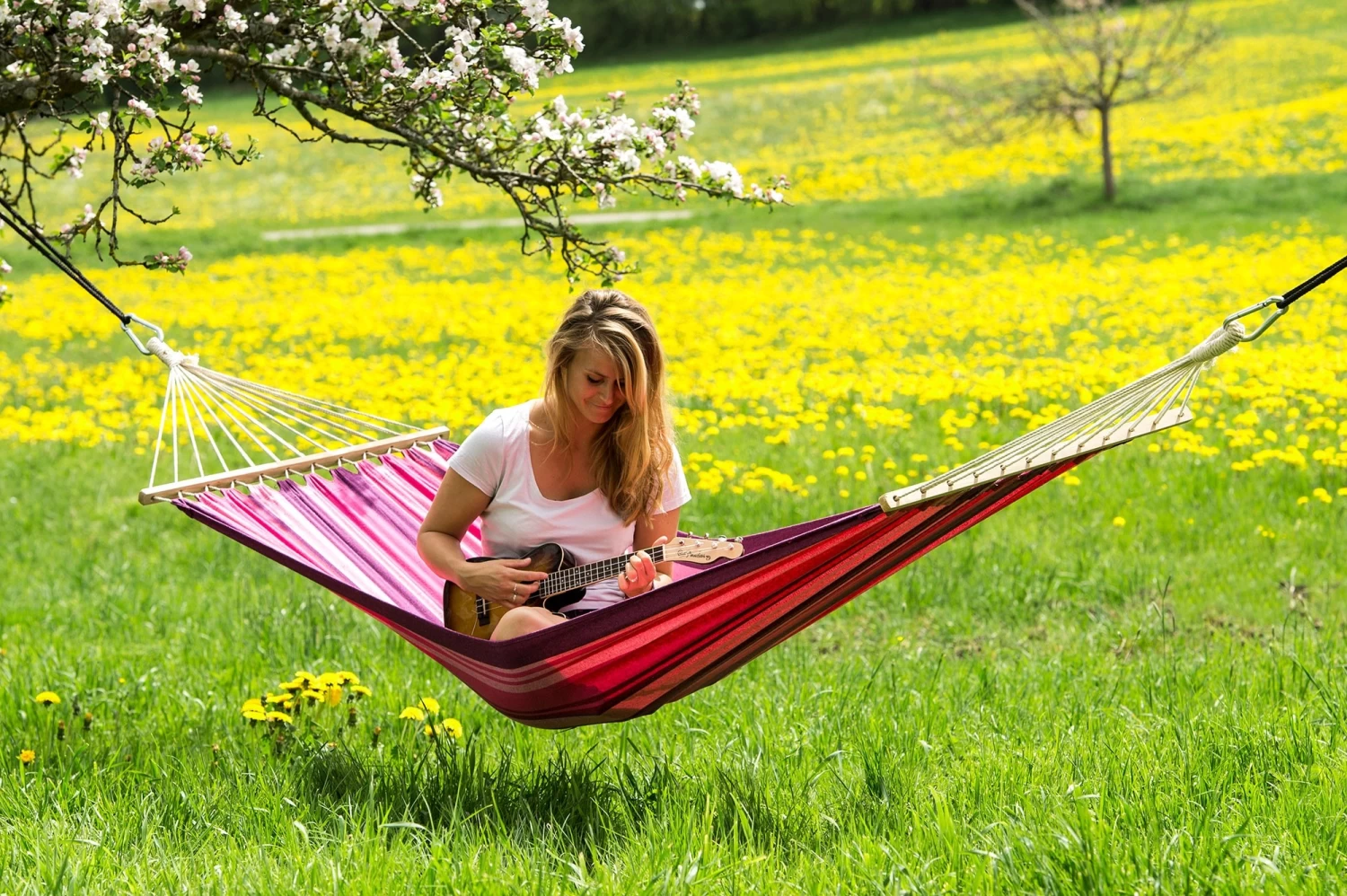 Diese Hängematte ist kein Riese, dennoch ist sie äußerst bequem. Durch die extra langen Schnüre und breiten Stoffbahnen haben wir es geschafft, dass selbst weniger große Hängematten wirklich bequem werden. Die Farbfamilie „candy“ist ein ansprechende Mischung aus Violett, Mauve und Rosatönen. Durch dieses extravagante Farbmuster ist ein absolutisches optisches Highlight.