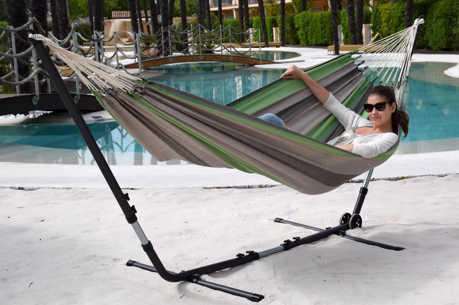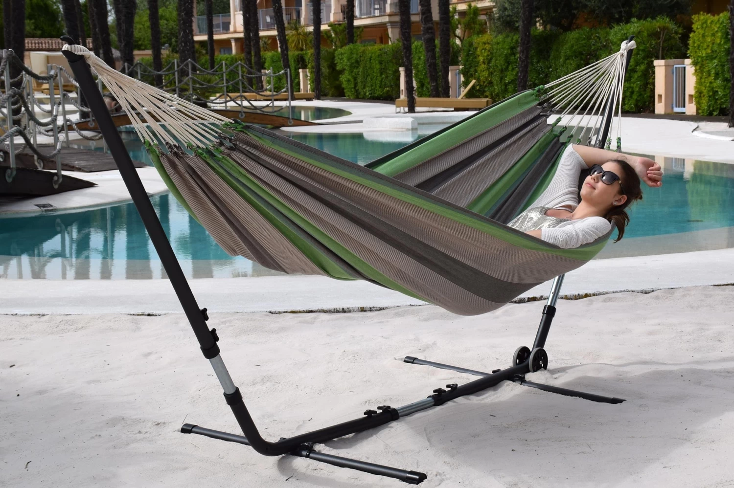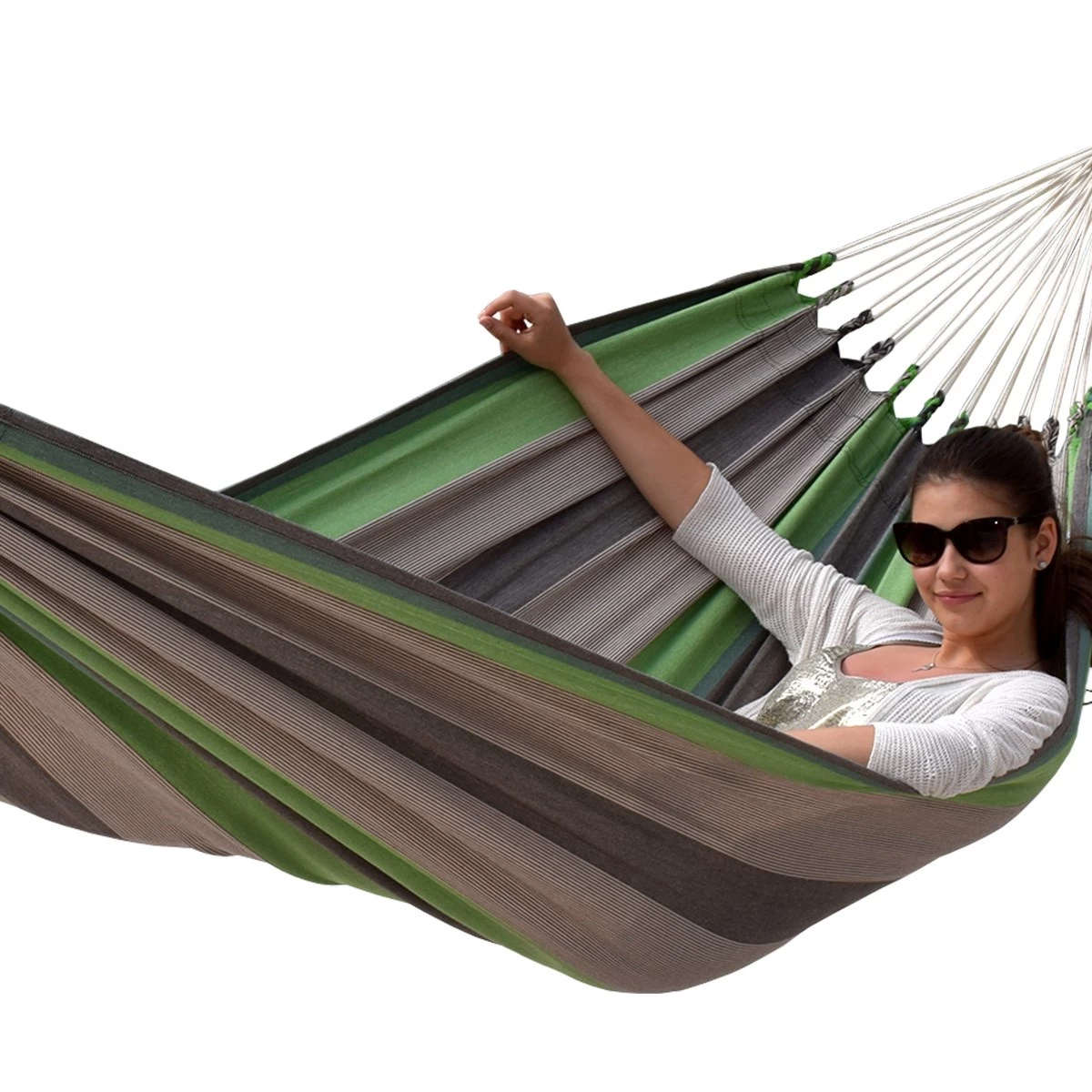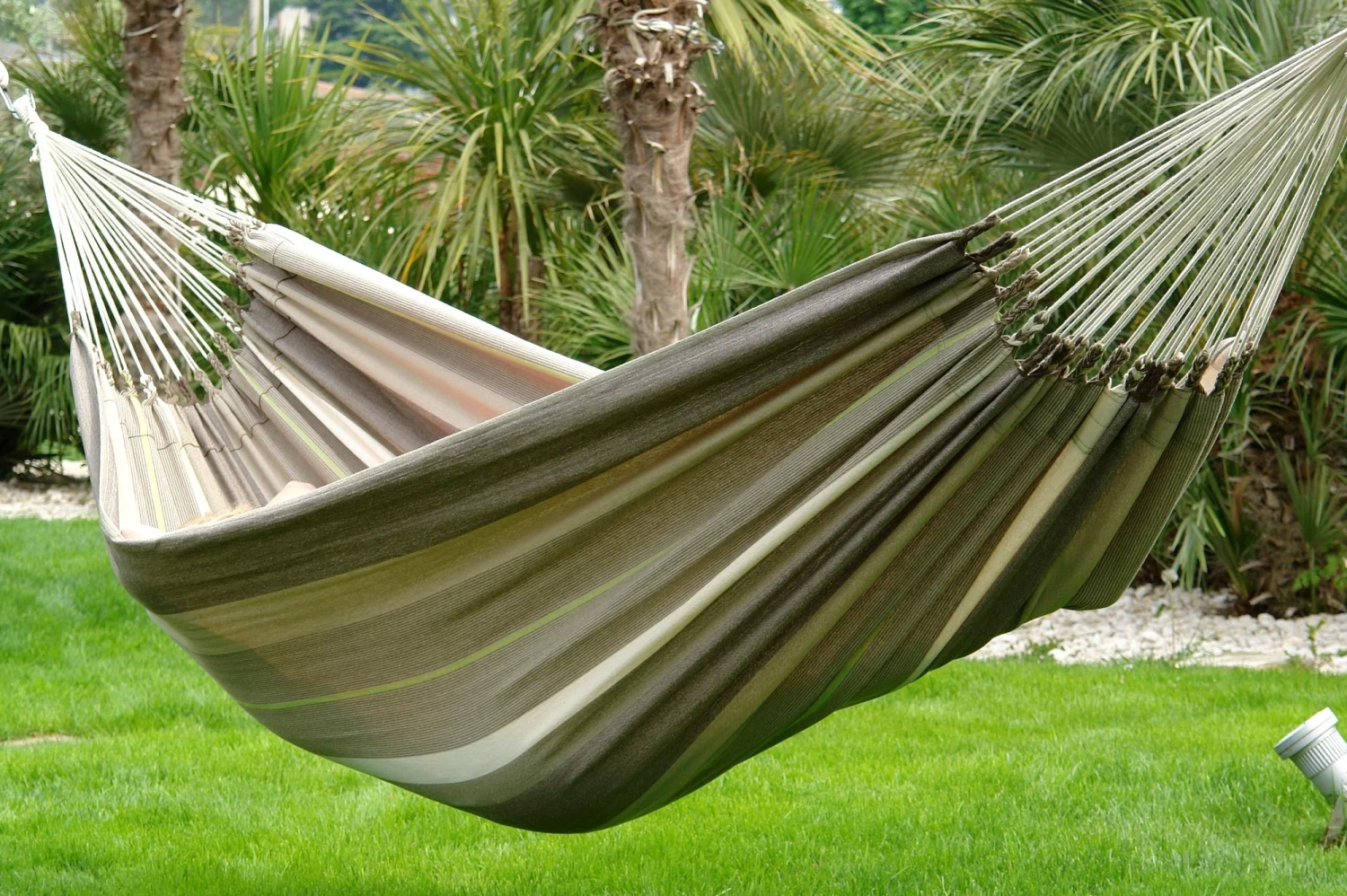 Ein absolutes Trendstück-die Hängematte Santiago Taupe Oliva in modischem Streifendesign. Ein Blickfänger in Ihrem Garten, welcher Ihnen einen vieljährigen Schaukelspaß verspricht.