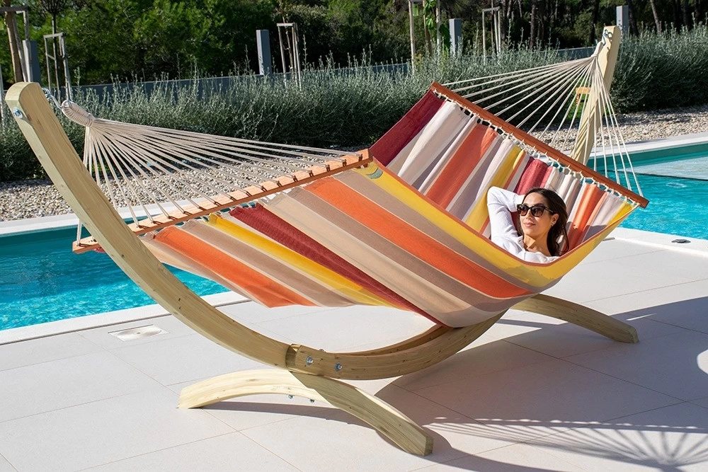 Mit der bunten Stabhängematte wird der Garten zum Hot Spot der Entspannung. Dank der angenehmen Größe der Liegefläche können Sie auch problemlos zu zweit die hervorragenden Vorteile der Stabhängematte genießen..