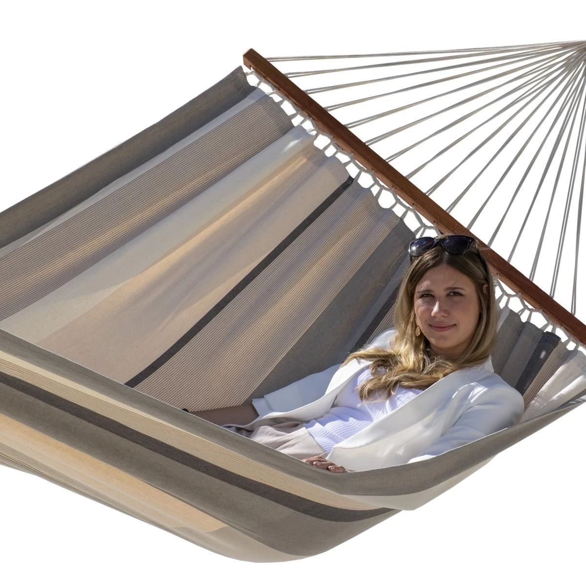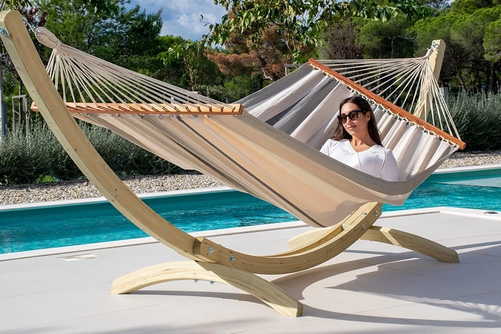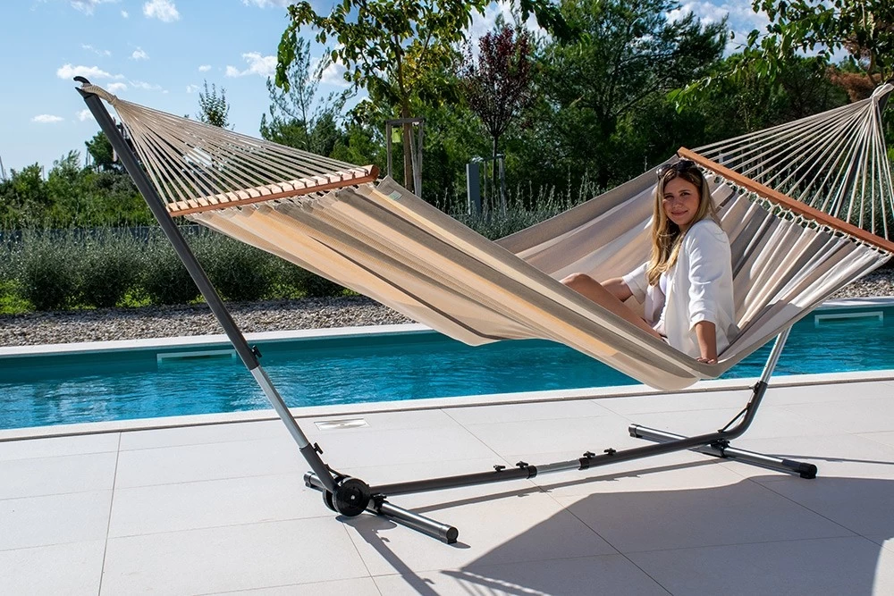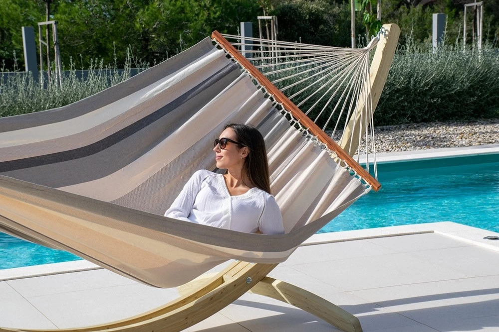 Die neue Stabhängematte für zwei Personen ist aus einem weichen und sehr gemütlichen Baumwollstoff gefertigt.