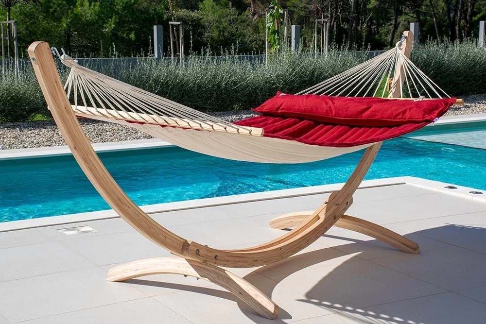 American Hammock Lifestyle von dem Hersteller Lola im sehr modernen Design und den Trendfarben creme und rot, verleiht Ihrem Garten einen luxuriösen und außergewöhnlichen Touch. Die richtige Wahl für vollkommenen Komfort und eine absolute Erholung vom Alltag.