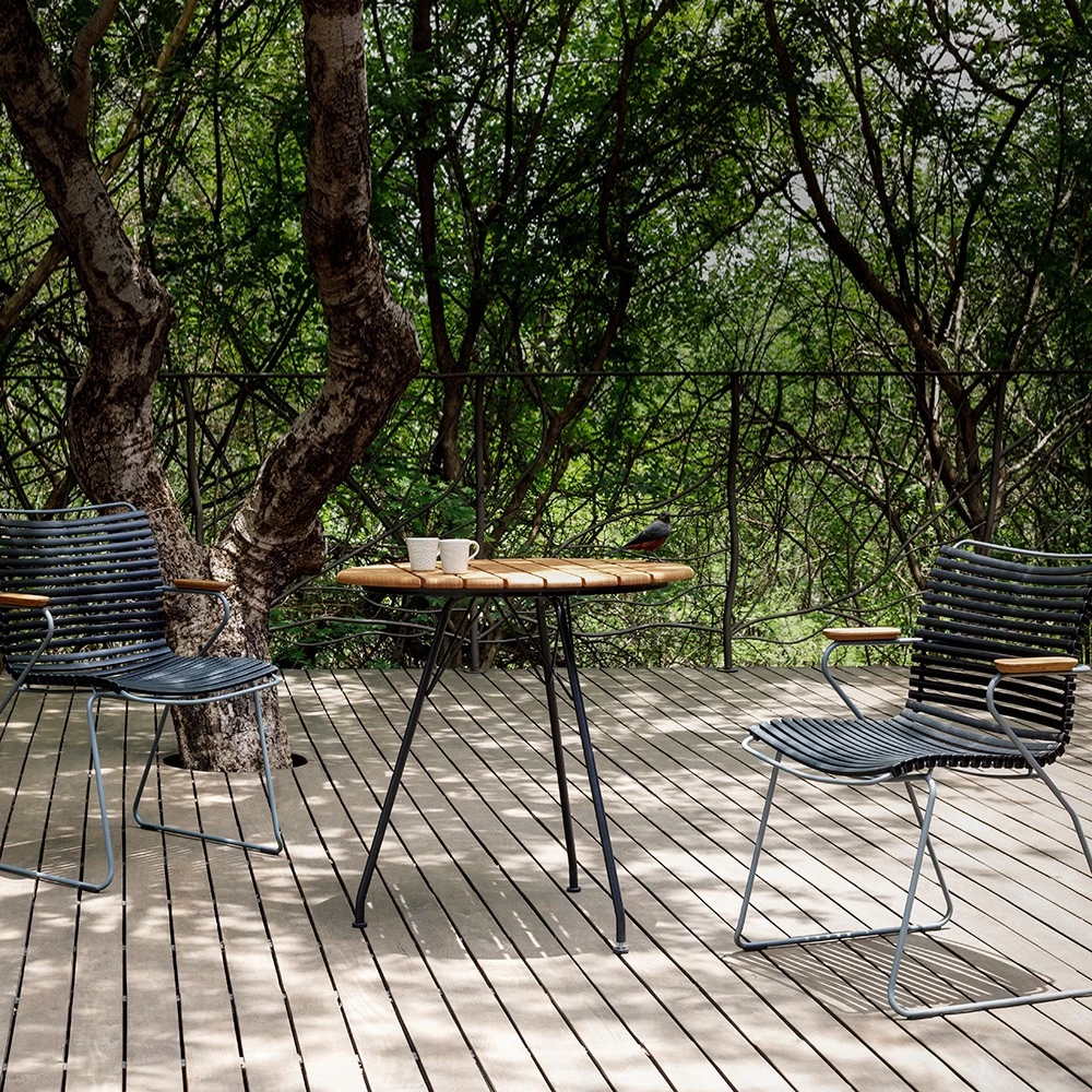 | 2x Houe CLICK Gartenstuhl mit Armlehne – Black 1x Houe CIRCUM Kaffeetisch aus Bambus Ø74 |