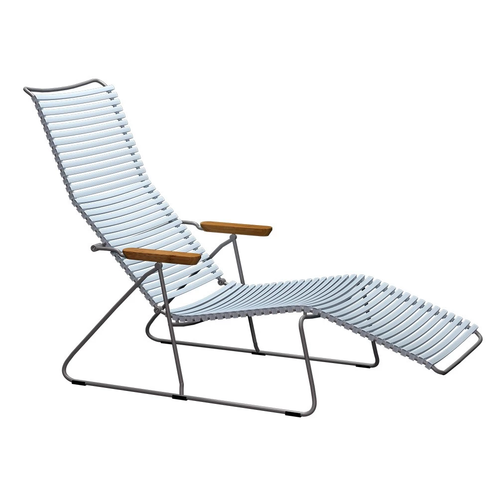 Entdecken Sie den CLICK Sonnenliegestuhl in der Farbe Dusty L. Blue! Dieser Sonnenliegestuhl ist nicht nur äußerst praktisch, sondern auch ein echter Blickfang. Der graue Rahmen und die Bambus-Armlehnen verleihen ihm einen natürlichen Touch. Hergestellt aus strapazierfähigem Kunststoff (PP) für die Sitzfläche und robustem Stahl für den Rahmen und die Basis, ist dieser Liegestuhl perfekt für den Einsatz im Garten geeignet.