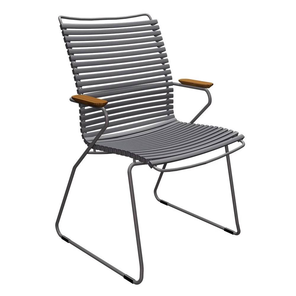 | 4x Houe CLICK Gartenstuhl mit hoher Rückenlehne – Dark grey 1x Houe FOUR Gartentisch aus Bambus Aluminium Dark grey 90×160 cm |