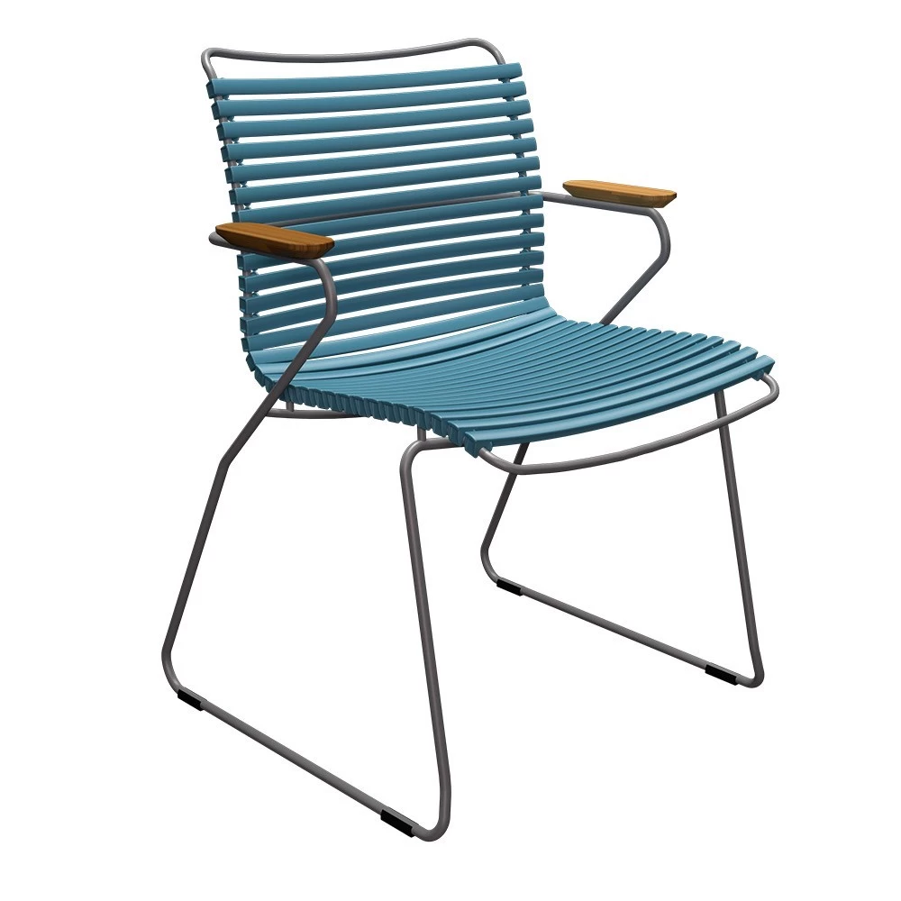 | 4x Houe CLICK Gartenstuhl mit Armlehne – Petrol 1x Houe CIRCLE Gartentisch aus Bambus Ø150 |