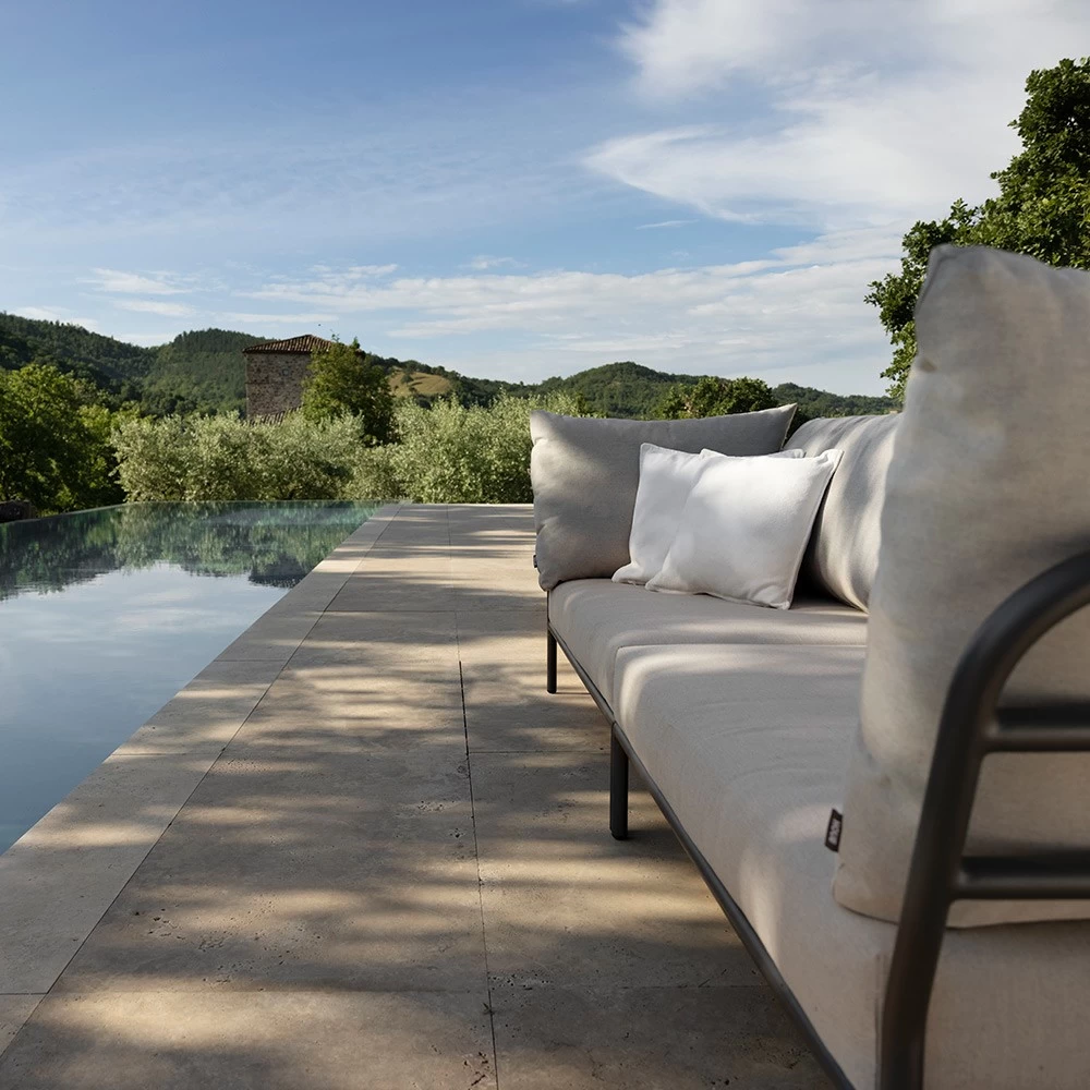 Der Rahmen und die Basis des Sofas bestehen aus Aluminium, was nicht nur für Stabilität und Standfestigkeit sorgt, sondern auch das Gewicht des Möbels reduziert. Dadurch können Sie das Sofa problemlos umstellen und nach Ihren Wünschen anordnen.