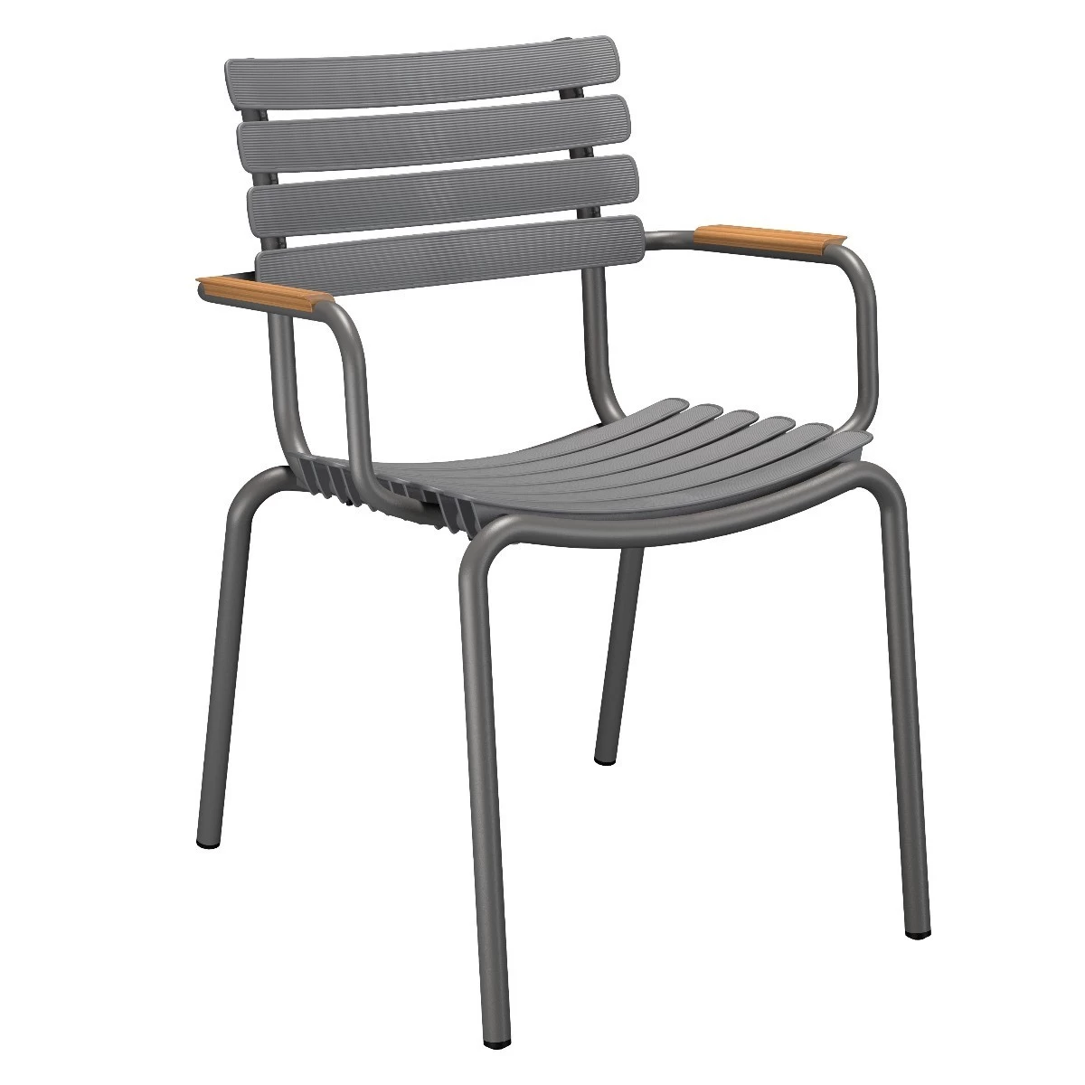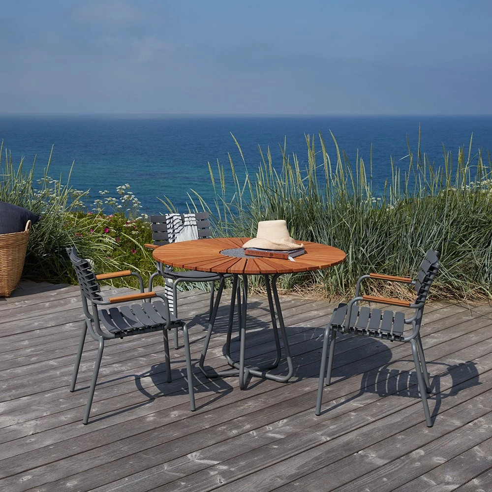 | 3x Houe ReCLIPS Gartenstuhl mit Armlehne aus Bambus – Dark grey 1x Houe CIRCLE Gartentisch aus Bambus Ø110 |