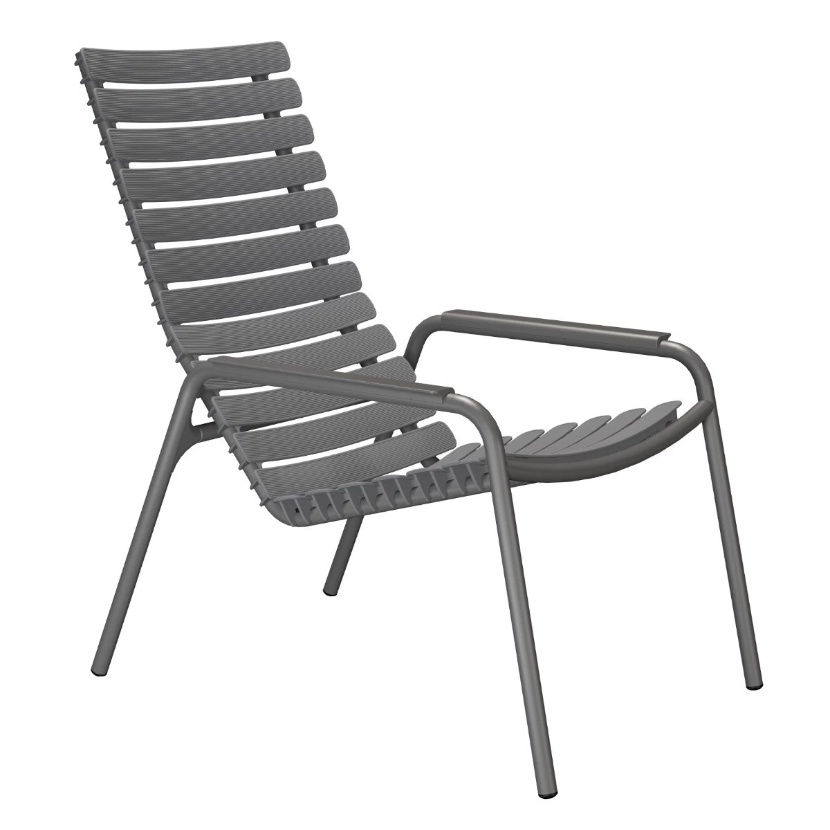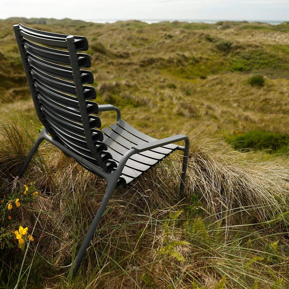 Der ReCLIPS Lounge-Sessel ist in einer eleganten dunkelgrauen Farbe erhältlich, die zu jeder Art von Garten passt. Die Armlehnen bestehen ebenfalls aus dunkelgrauem Aluminium und verleihen dem Sessel einen edlen Touch.