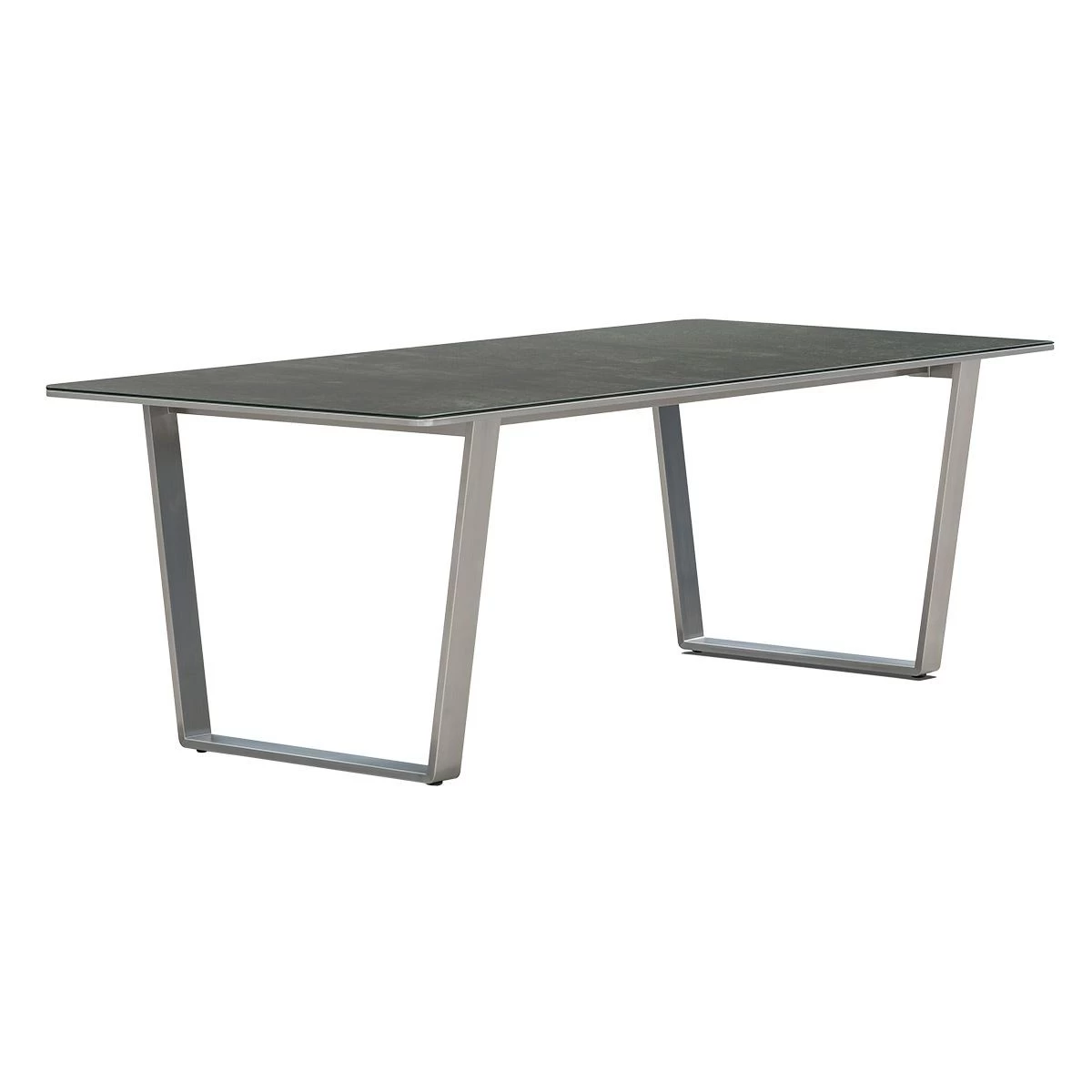 | 3x Lola Stapelsessel Mia Rope Edelstahl gebürstet Rope dark grey mit Aluminiumarmlehnen 56*61*92cm 1x Lola Kufentisch Edelstahl mit Keramikplatte 200×99.5x75cm 1x Lola Elements Lounge und Dining 3-Sitzer Aluminium graphite pulverbeschichtet inkl. Tuva dark grey Kissen, beidseitig verstellbar 195x75x70cm |