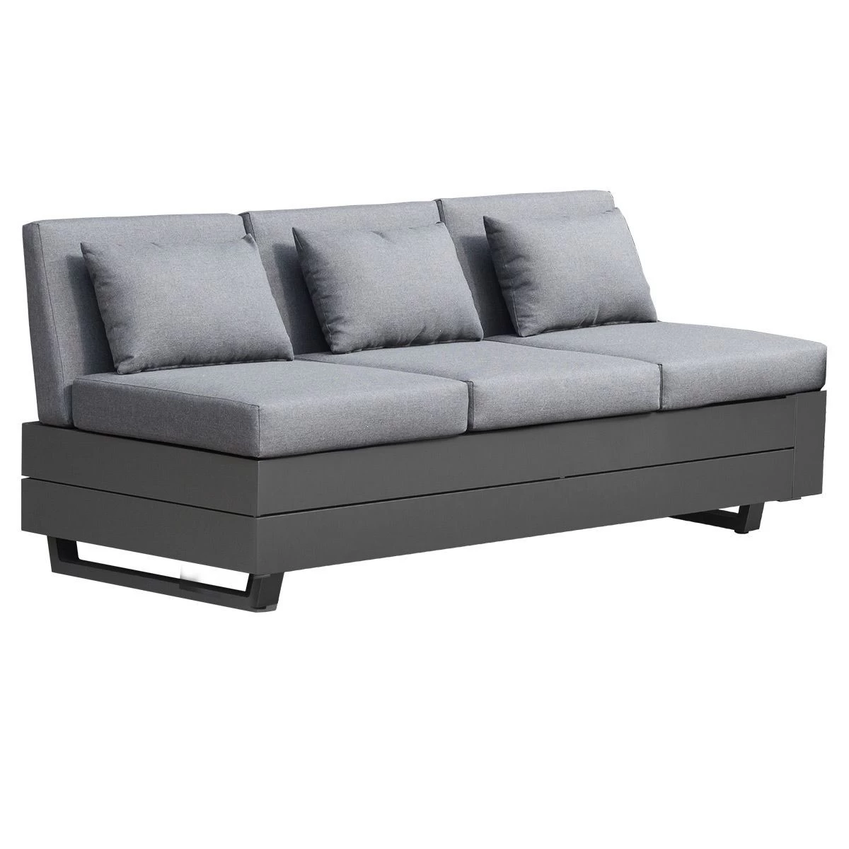 | 3x Lola Stapelsessel Star Edelstahl gebürstet/Textilen silbergrau mit Aluminiumarmlehnen 57x60x91cm 1x Lola Kufentisch Edelstahl mit Keramikplatte 200×99.5x75cm 1x Lola Elements Lounge und Dining 3-Sitzer Aluminium graphite pulverbeschichtet inkl. Tuva dark grey Kissen, beidseitig verstellbar 195x75x70cm |