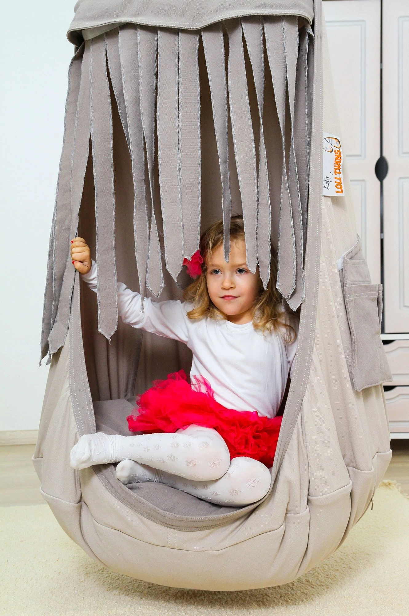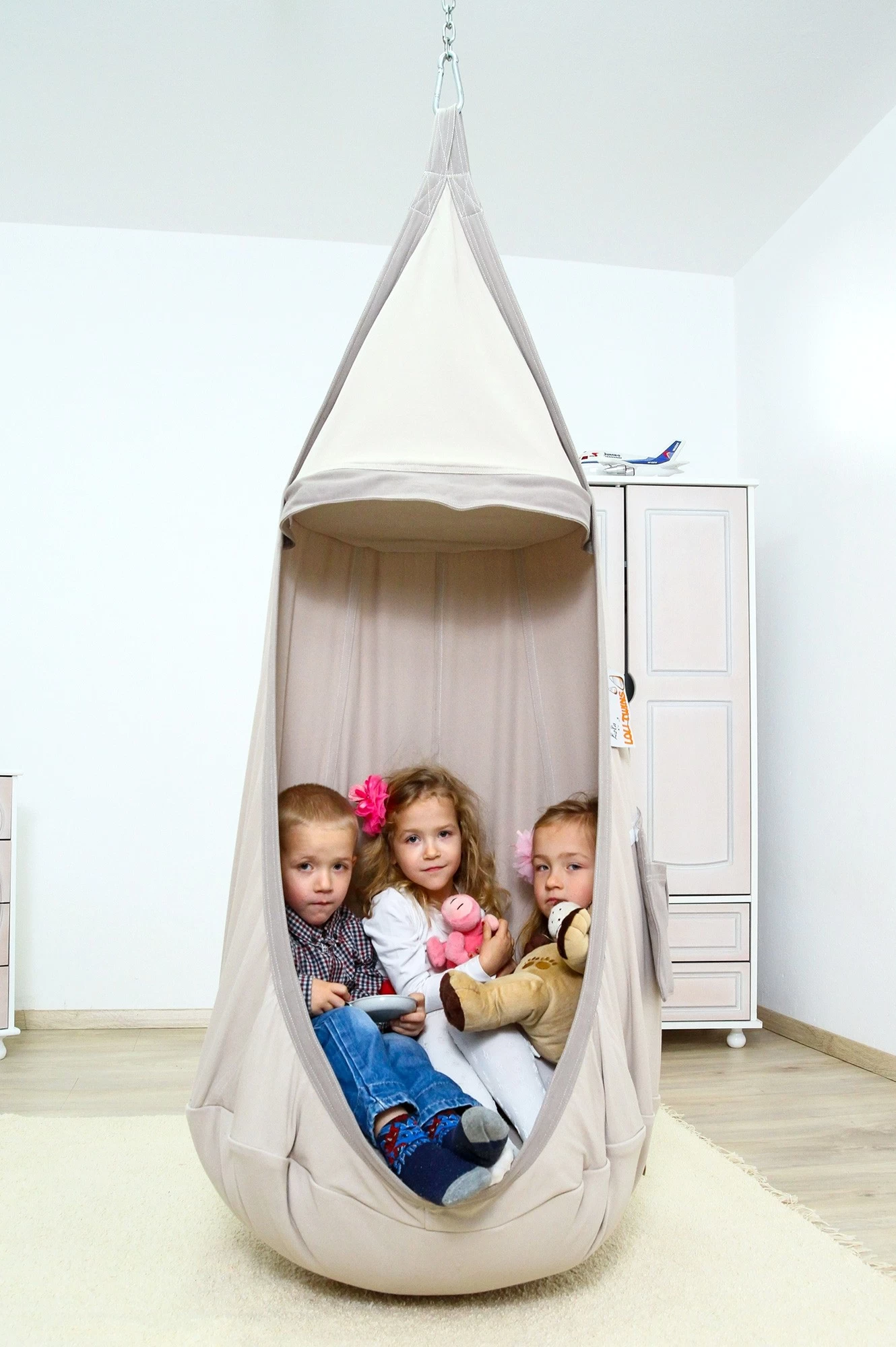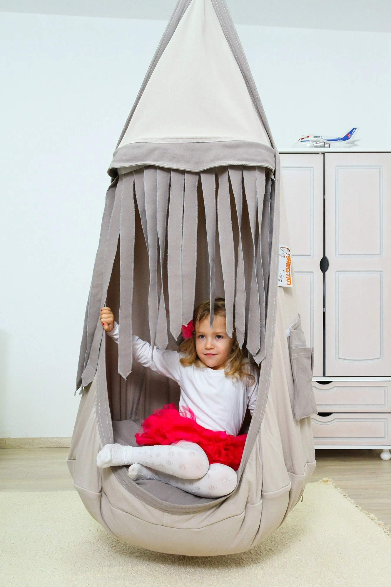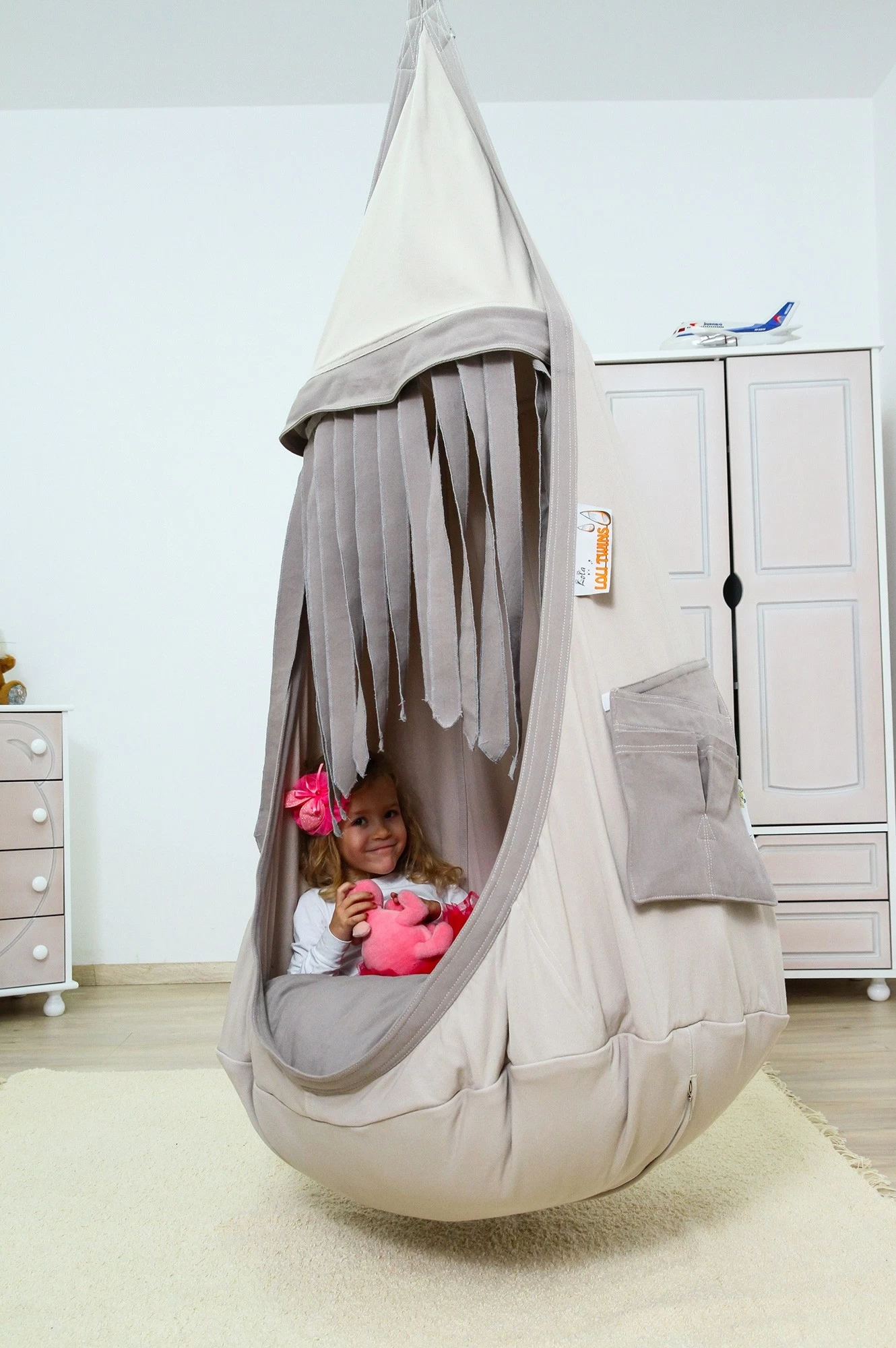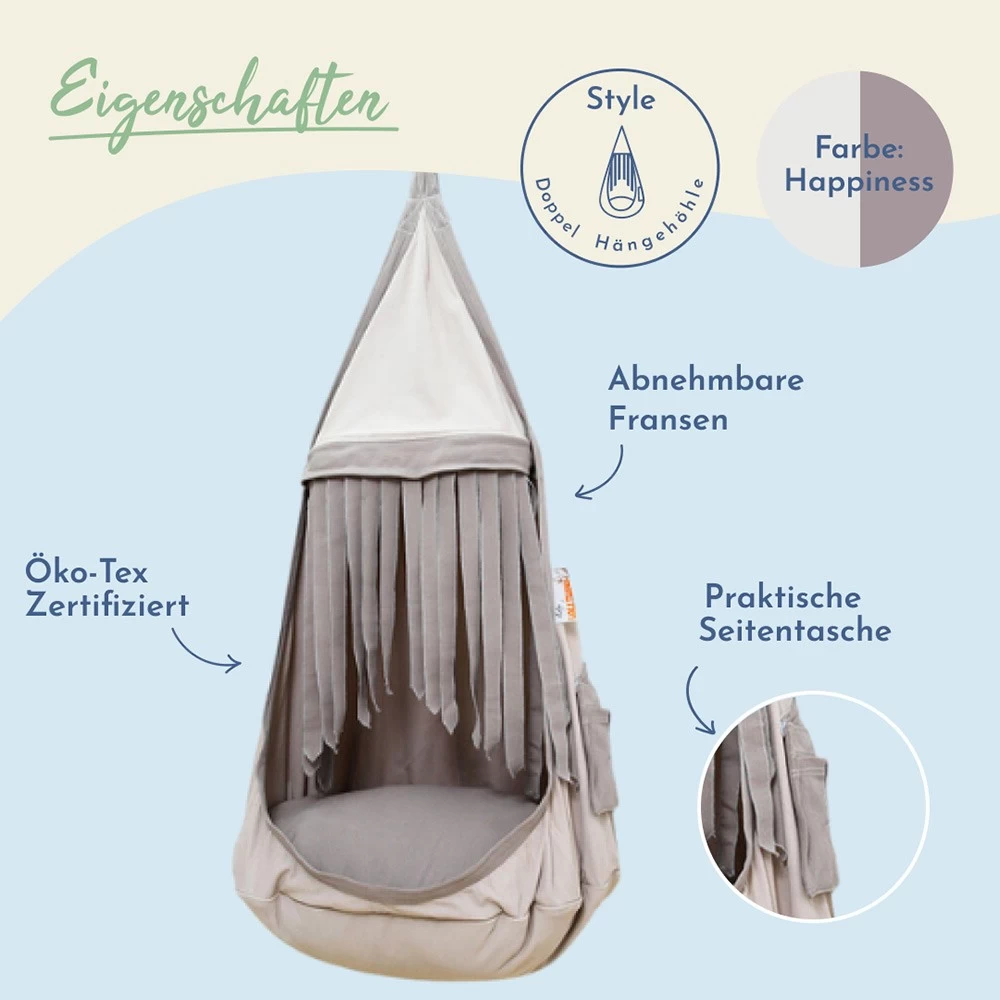 Ein wunderschönes Geschenk, welches Ihren kleinen Rabauken jede Menge Freude und Action, sowie Ruhe und Geborgenheit bieten kann. Der ideale Platz zum Toben, Springen und Auspowern. Die Hängehöhle eignet sich aber auch hervorragend für ein paar ruhige Stunden. Dank des großzügigen Platzes im Kindernest können Kinder sich gemütlich ausbreiten und auch ein kleines Nickerchen machen. Hierbei sind die Fransen am Loli sehr praktisch, denn sie bieten eine lustige Versteckoption. Nach Bedarf lassen Sie sich aber auch kinderleicht entfernen und wieder anbringen, dank des angebrachten Klettverschlusses oder man bindet sie in ein oder zwei Schleifen zusammen.