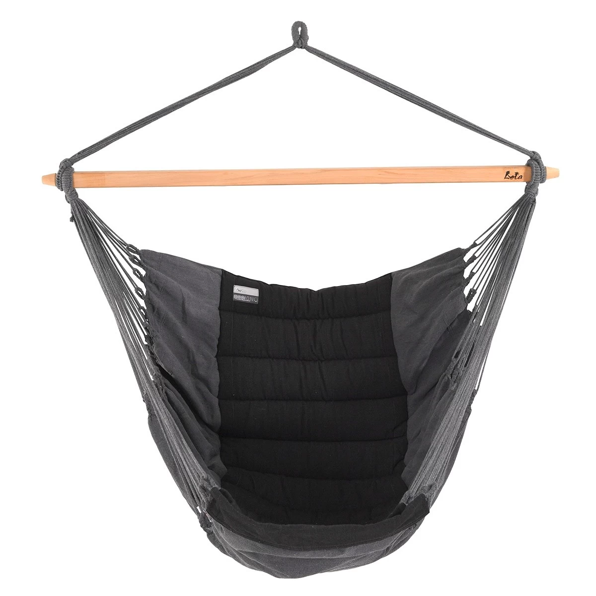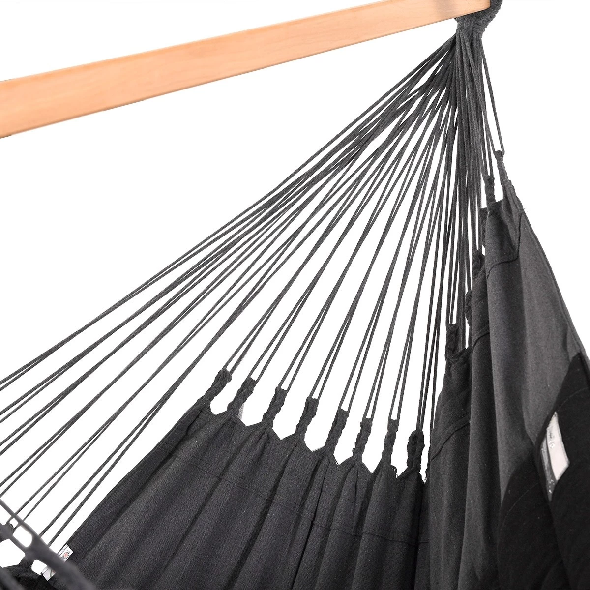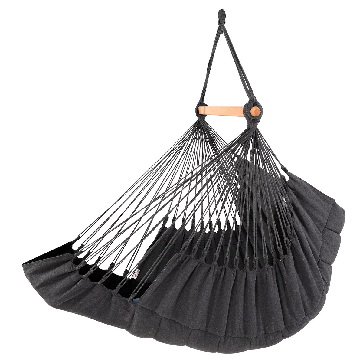 Die Sitzfläche dieses Hängestuhls endet beidseitig mit Zöpfen, die sehr dekorativ sind und die Belastbarkeit und Langlebigkeit der Hängestühle deutlich erhöhen. Die Zöpfe sind eine Garantie der Qualität bei den Hängematten und Hängestühlen. Das ist ein wichtiges Merkmal, worin sich unsere handgefertigte Produkte von denen anderer Hersteller unterscheiden. Die aus dem Webstoff der Hängematten herausgearbeiteten Zöpfe sorgen dafür, dass das zu tragende Gewicht gleichmäßig auf alle Aufhängeschnüre verteilt wird.