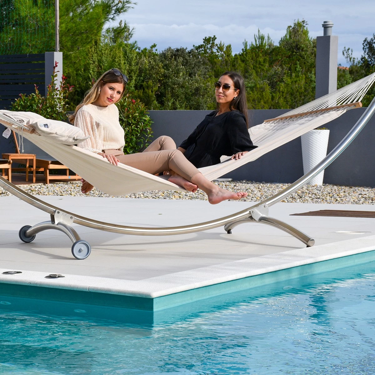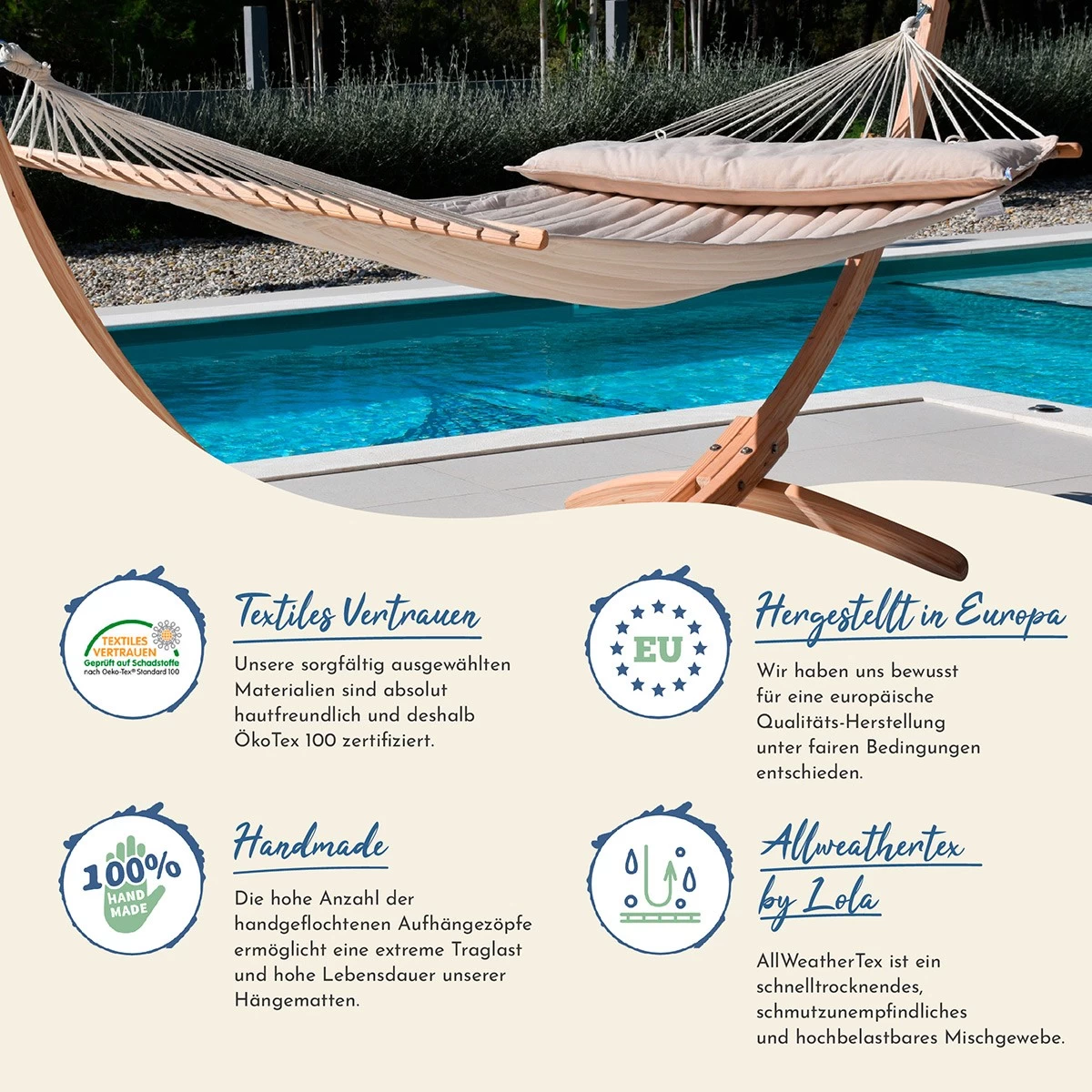 American Hammock Lifestyle von dem Hersteller Lola im sehr modernen Design und der Trendfarbe cofea crema, verleiht Ihrem Garten einen luxuriösen Touch. Die richtige Wahl für vollkommenen Komfort und eine absolute Erholung vom Alltag.
