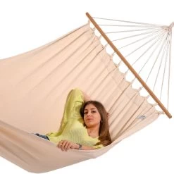 Eine neutrale und elegante Stabhängematte, welche Ihren Garten in eine Entspannungsoase verwandelt, in welcher Sie zur Ruhe kommen und Kraft tanken können.