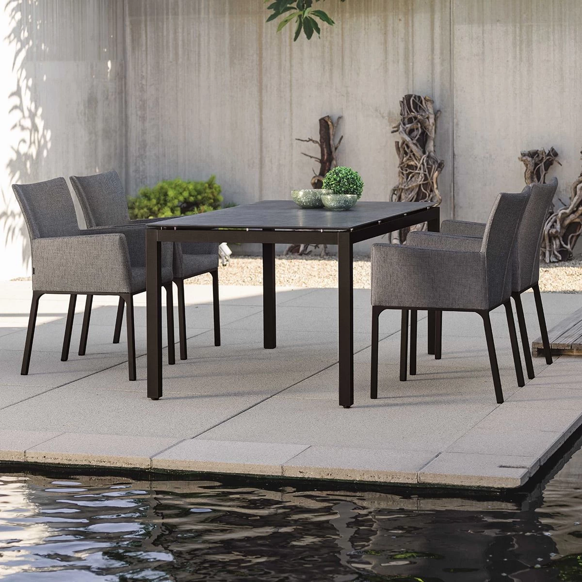 | 4x Stern Sessel Artus Aluminium schwarz matt Bezug Outdoorstoff seidenschwarz 1x Stern Silverstar 2.0 Tischplatte 160x90x1.3 cm, Dekor Dark Marble 1x Stern Tischgestell 160×90 cm Classic Aluminium schwarz matt mit Nivelliersystem |