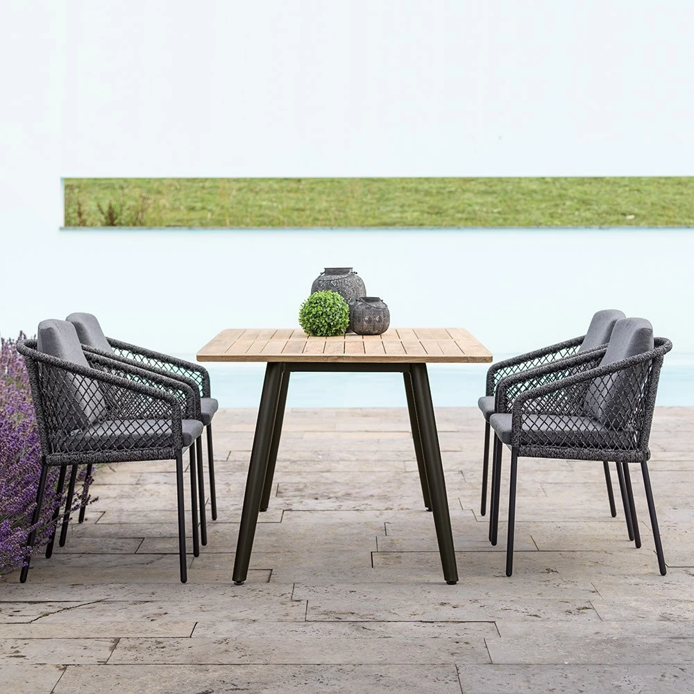 | 4x Stern Sessel Odea Aluminium schwarz matt/Kordel pepper/Kissen 100% Polyacryl seidenschwarz 1x Stern Tisch 180x100cm Interno Rundrohr konisch Alum. schwarz matt/Tischplatte Teak |