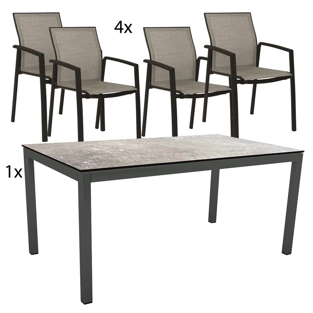 | 4x Stern Stapelsessel Kari Aluminium schwarz matt mit Bezug Textilen Leinen grau 1x Stern Tischgestell 160×90 cm Classic Aluminium anthrazit mit Nivelliersystem 1x Stern Silverstar 2.0 Tischplatte 160x90x1.3 cm, Dekor Vintage Stone sonstige Kissen oder Zubehör sind nicht im Lieferumfang enthalten |