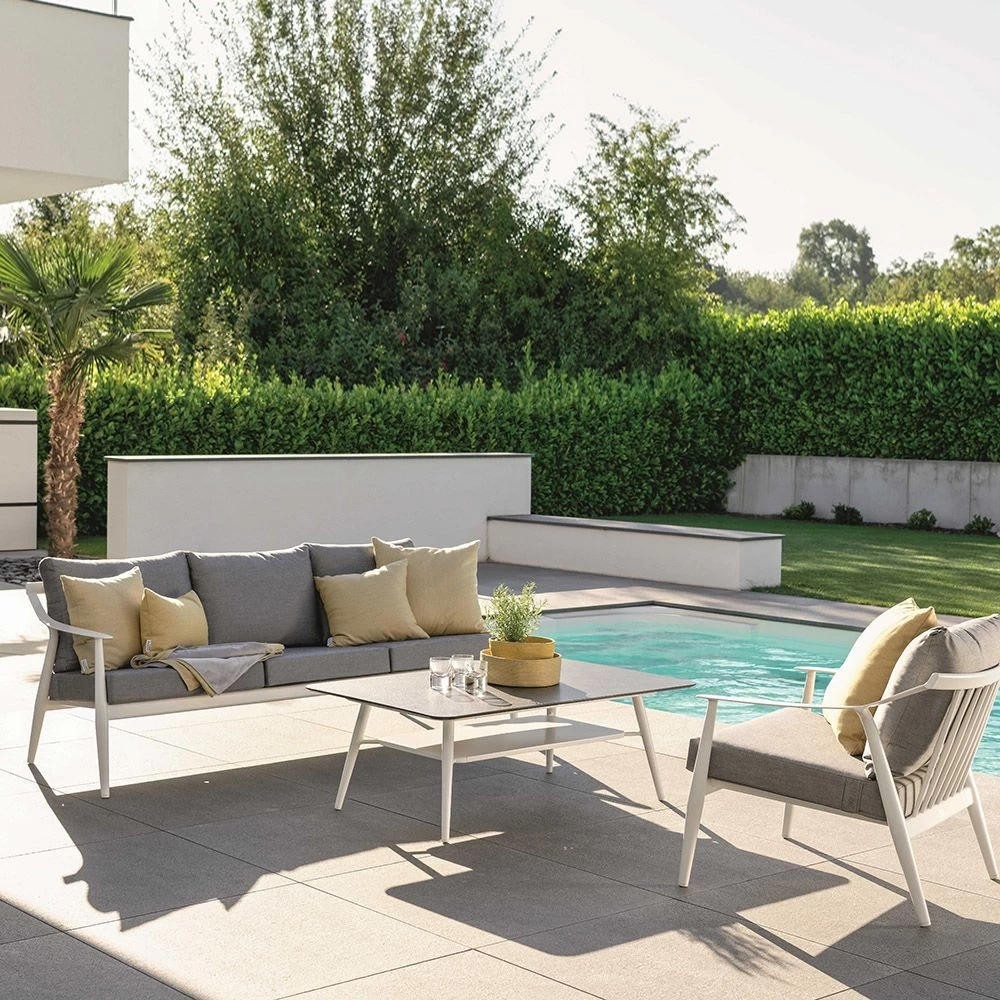 | 1x Stern VANDA Lounge 3-Sitzer Sofa Alu weiß mit Polsterung seidengrau aus 100% Polyacryl 1x Stern VANDA Lounge Sessel Alu weiß mit Polsterung seidengrau aus 100% Polyacryl 1x Stern VANDA Lounge Tisch Alu weiß mit Tischplatte Silverstar 2.0 Dekor Dark Marble und Ablagefach |