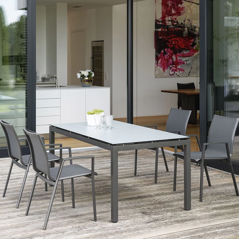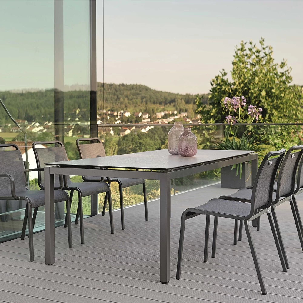 Stern Dining Set Mit Freischwinger Greta Champagner, Tisch 220×100 Interno Teak Platte Zement Hell