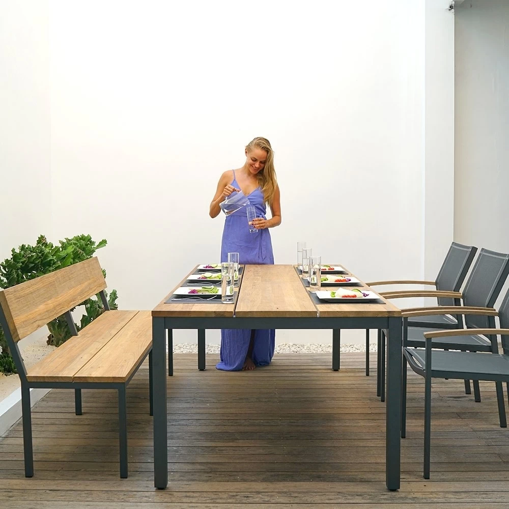 Das verwendete Teakholz harmoniert hervorragend mit dem Gestell aus Aluminium und versprüht einen natürlichen Charme. Teak ist überaus robust und wird deshalb sehr gerne in der Gärtenmöbelbranche eingesetzt.