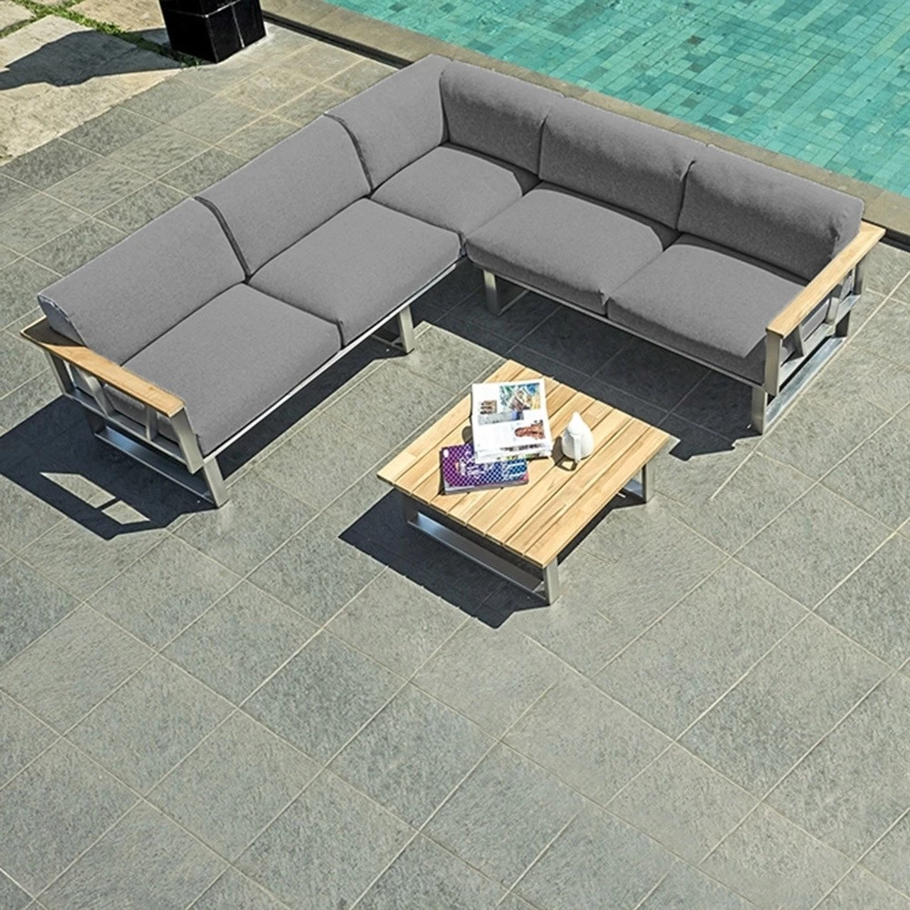 Dieses Lounge-Set ist so konzipiert, dass es sich nahtlos in jede Außeneinrichtung einfügt, von Gärten und Terrassen bis hin zu Poolbereichen. Es strahlt eine zeitlose, moderne Eleganz aus, die durch die Verwendung von Edelstahl, Textilen und Teakholz unterstrichen wird.