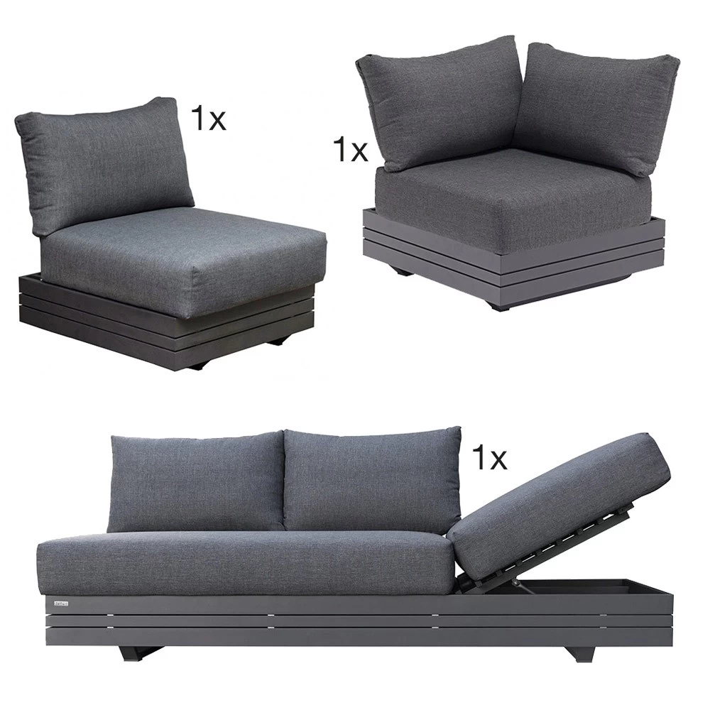 | 1x Zebra Cubo Lounge 1-Sitzer, Aluminium graphite, ikl. Olefin-Kissen dark grey, Rücken einklappbar 1x Zebra CUBO LOUNGE Eckelement, Alu-Rahmen graphite, Bezug Olefin dark grey 1x Zebra Cubo Lounge 3-Sitzer Aluminium graphit, inkl. Olefin Kissen dark grey, beidseitige Verstellung |