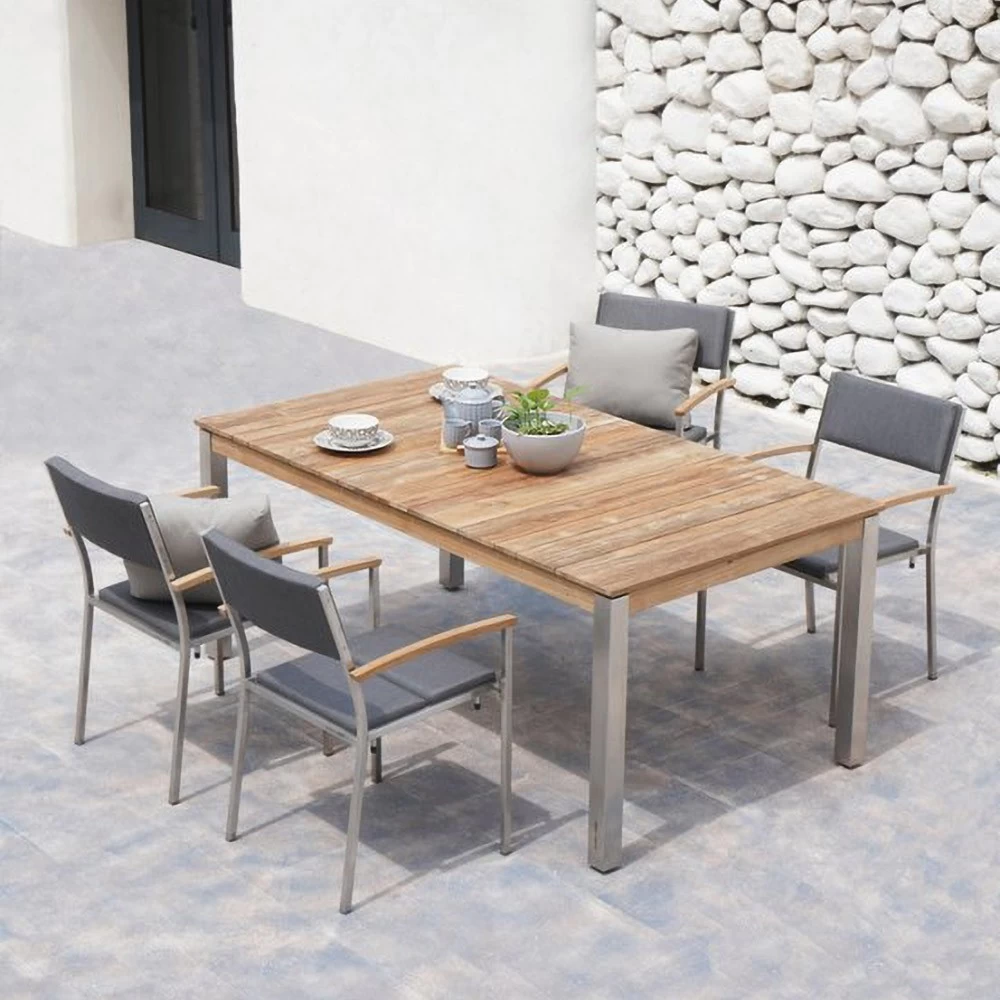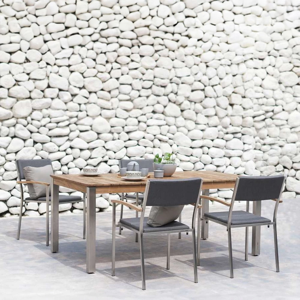 Der Zebra Derex Gartentisch kombiniert Edelstahl und recyceltes Teakholz zu einem Möbelstück, das ebenso robust wie elegant ist. Dieser Tisch ist eine perfekte Wahl für diejenigen, die sowohl Funktionalität als auch Design schätzen.